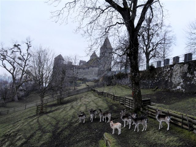 По легенде, во время охоты самка оленя, преследуемая собаками, укрылась в небольшой пещере, куда последовали охотники. Там они обнаружили двух оленят. Графиня Рапперсвиль попросила супруга сохранить им жизнь и отозвать собак. Позже, когда графская чета отдыхала после охоты в тени деревьев, к ним вдруг приблизилось спасенное животное и низко поклонилось даме. Потрясенный граф велел доставить все семейство в свои владения в Альтендорфе, а чуть позже, принимая все произошедшее как знак свыше, решил начать строительство замка на высоком холме. При замке с 1871 года существует парк, где пасутся 10 благородных оленей.