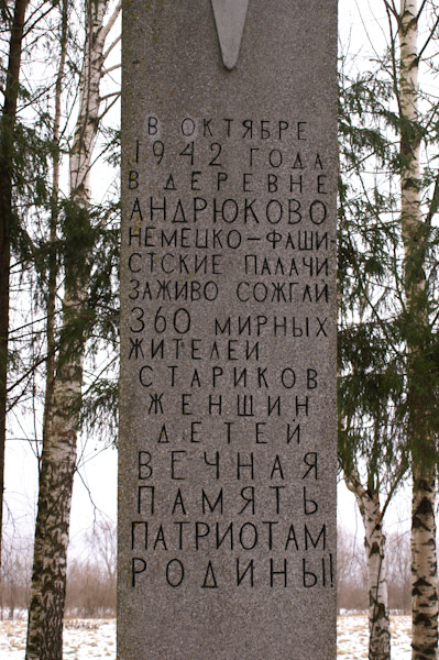 Потом пришли жители соседних уцелевших деревень, выкопали могилу и похоронили в ней останки. (После войны, было перезахоронение и был установлен обелиск, на месте сожженной деревни Андрюково.)