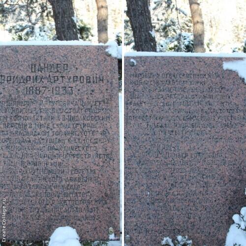 Слева от памятника две плиты красного гранита с биографической справкой о Ф.А. Цандере.