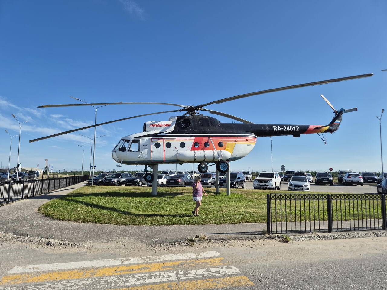 На выходе из аэропорта сразу бросается в глаза постамент с установленным на него вертолетом МИ-8 стоит он тут не случайно