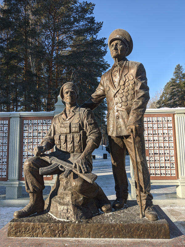 Ключевой композицией комплекса стал бронзовый памятник защитникам Отечества. Образ ветерана Великой Отечественной войны списан с Сергея Ивановича Воробьёва, единственного участника войны, проживающего сейчас в Заречном (в свои 98 лет он лично присутствовал на открытии комплекса). А образ молодого военного – с Евгения Сергеевича Русанова, первого зареченца, погибшего в ходе специальной военной операции.