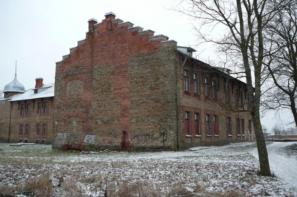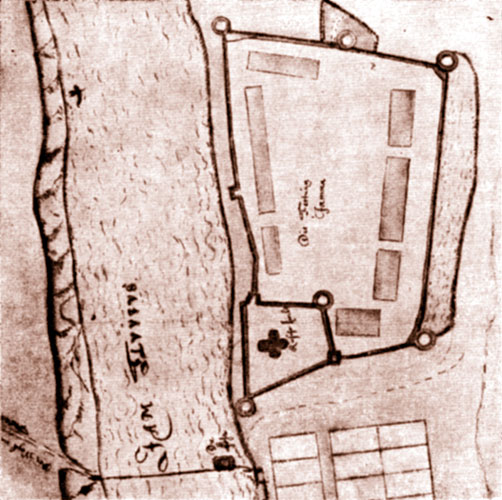 За стенами крепости размещались дома, казармы для воинов гарнизона, склады ядер и пороха, провианта. Здесь же находилась каменная церковь — типичная четырехстолпная постройка новгородских мастеров XIV в.