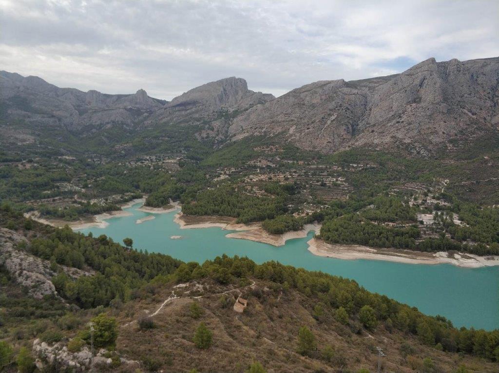 С балкона города открывается прекрасный вид на водохранилище с водой лазурного цвета.
