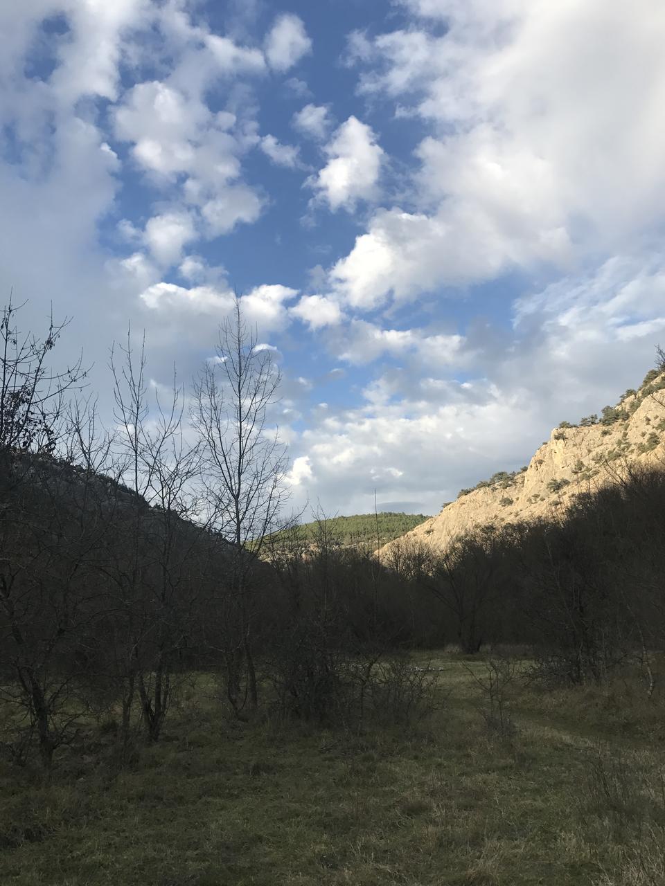 Мурзак-Дегермен-Алан. Или просто Дегермен-Алан. Впрочем, а также "Мурзацкая поляна" или "Мельничная поляна". Дегермен - мельница. Алан - поляна. Мурзак... Последнее время чаще всего слышно, что мурзак-заяц. Мурзак-Коба (над этой поляной) - заячья пещера. Ну и выходит, что поляна эта - с заячей мельницей. Конечно, очень даже могла она получить название по какому-нибудь запомнившемуся случаю, главным участником которого был заяц. Или охоты заячьи в этих краях хороши были. Или разводил зайцев хозяин этой мельницы. Да мало ли... Но также местные жители рассказывают, что названа она так потому, что принадлежала некоему мурзе, проживавшему, вероятно, в Чоргуне (Черноречье)- дорога-то накатанная туда самая короткая. Может, от его дома и башня в Черноречье осталась? На поляне у мурзы (или не у мурзы?) были водяная мельница и сад. От мельницы там сохранились канал и развалины. А ещё до недавних пор по поляне кочевал огромный жернов - его пикникующие пользовали в качестве стола. А от сада - одичавшие вишняк и грецкие орехи и разросшиеся терновник и, кажется, кизил.