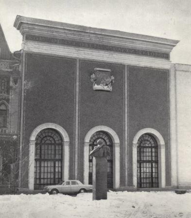 Центральная часть имеет вид фасада-декорации с тремя арочными порталами, украшенной светло-серым мрамором, красными керамическими плитками, искусственным белоснежным камнем и золотом смальты. Венчает фронтальную сторону постройки работа Владимира Фаворского — майоликовый картуш со схематическим генеральным планом столицы. Архитектор здания Буров вдохновлялся фреской итальянского художника Пьеро делла Франческа в церкви Сан Франческо в Арецо, где изображено похожее по архитектуре здание.