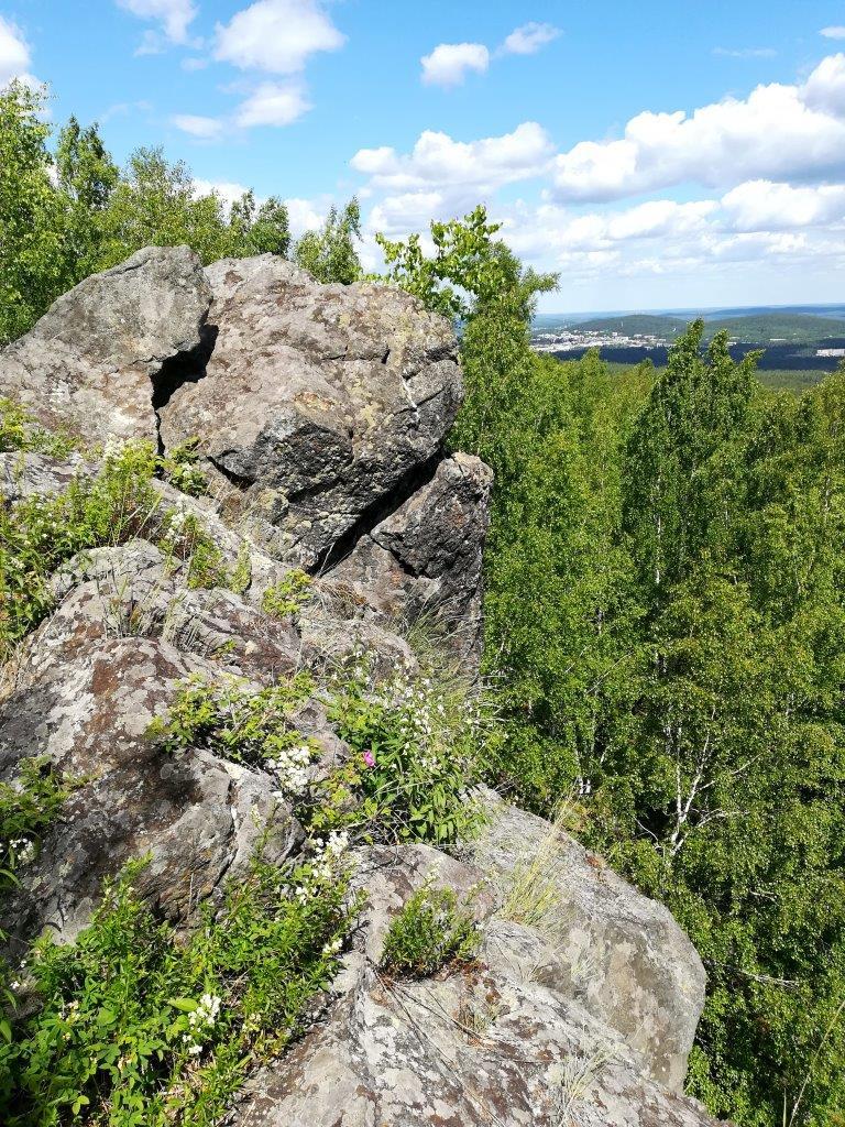 Скалы расположены в точке N 57 12.459', E 60 02.457'. спуск вниз возможен с правой стороны. Слева есть курумник, так что любители могут пройти и там. Обзор открыт только на восточной стороне, западная закрыта лесом. Но то, что открывается взору стоит пройденного на скалу пути. Со скал можно поразглядывать, например, город Новоуральск. Район Южный отделен от города лесочком и создаётся впечатление, что это разные населённые пункты, но это не так. А еще Верх-Нейвинский пруд, с островом Шапка (это мы его так назвали, из-за его формы и деревьев на нём растущих), и по правую руку озеро Таватуй с его поселком. Пытались разглядеть и угадать горы с Вороньими скалами и скалами Семь Братьев. Братьев вроде увидели, Вороний не угадали. С этой точки открывается очень неплохой вид на горы Среднего Урала. Цепочка гор аналогична видам с Южного Урала (Обычно у нас отдельные вершины видны). Еще со скал видно войсковое стрельбище охраны города. Это прямоугольный оазис посреди леса в сторону Таватуя. На этом стрельбище тренируется ведомственная охрана города. Территория оцеплена местами упавшей и вросшей в деревья колючей проволокой и земляными валами. Тем не менее скалы находятся в зоне обстрела, поэтому на время стрельб пути на скалу могут быть перекрыты.