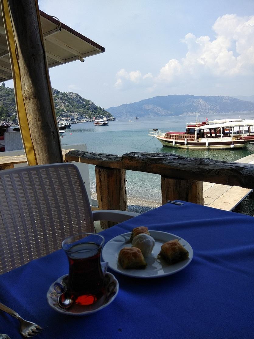 В итоге в Амос мы приплыли и пошли гулять по берегу бухты. В древний город подниматься не стали, начитавшись о мизерности сохранившихся развалин. Попили чай с турецкой пахлавой и мороженым в прибрежном ресторане.
