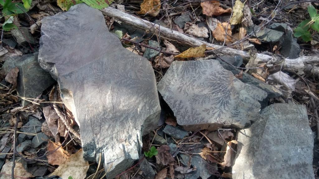 В некоторых местах Салаирского кряжа на различных горных породах встречаются также отпечатки листьев и стеблей травянистых папоротников, хвощей и некоторых других палеозойских растений. Бывает, что несведущие люди принимают за отпечатки листьев древних растений так называемые дендриты – естественные минеральные «рисунки» древовидной формы, которые, подобно морозным узорам на стекле, образуются в результате быстрой кристаллизации в тонких трещинах между слоями горных пород. Дендрит представляет собой ветвящееся и расходящееся в стороны образование, возникающее при ускоренной или стеснённой кристаллизации в неравновесных условиях, когда кристалл расщепляется по определённым законам. Эти причудливые изображения можно увидеть на поверхности расколотых камней, обычно они образованы окислами марганца. Дендриты настолько похожи на отпечатки веточек каких-то древних папоротников, что иной раз люди не могут поверить в то, что это чисто минеральное образование, не имеющее отношения к органической природе. Узорчатые камни часто встречаются в щебёночных карьерах Буготакских сопок, в некоторых местах Салаирского кряжа. Красивые дендриты есть в скальных выходах долины реки Улыбердь, возле села Новошмаково Черепановского района.