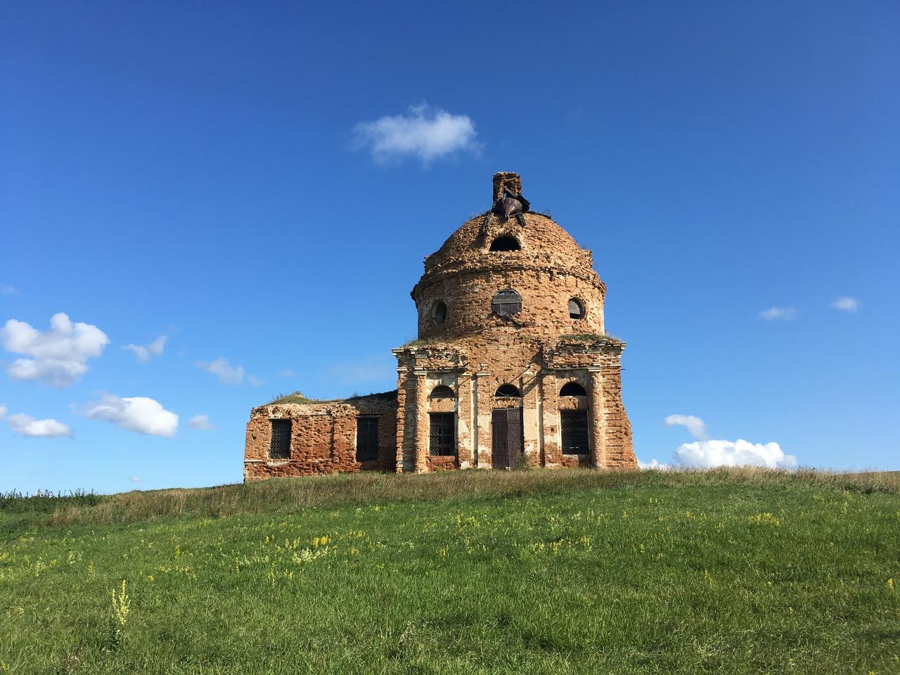 Бесстолпный четверик основания храма несет массивную световую ротонду с восемью круглыми окнами, покрытую полусферическим куполом с люкарнами по сторонам света. Купол увенчан кубическим постаментом, стоявшим в основании несохранившихся главки с крестом. Окна верхнего света храма полуциркульные. В прямоугольные нижние окна храма и трапезной вставлены железные решётки. Двери южного и северного фасадов храма окованы железом. Массивный кованый храмовый крест упална землю в 1990 годы и был впоследствии утрачен. Упавшая смятая главка сохранилась на куполе храма. Невысокая трапезная перекрыта полуразрушенным коробовым сводом. Северный и южный фасады храма были оформлены четырёхколонными портиками тосканского ордера с развитыми фронтонами (полуразрушены). Северный и южный входы фланкированы пилястрами. Верх четверика фасада храма и светового барабана украшает профильный карниз с модульонами. Углы храма декорированы рустованными лопатками. Храм был оштукатурен и побелен. Капители, карнизы в углах здания и часть модульонов сделаны из белого известняка. Оконные и входные проёмы храма, трапезной и колокольни прямоугольные. Над проёмами храма устроены полуциркульные окна. Световой барабан прорезан восемью круглыми оконными проёмами с радиальными рамами. Купол храма по сторонам света прорезан полукруглыми люкарнами по сторонам света. Высокое пространство храма перекрыто купольным сводом. Переходот четверика к восьмерику осуществлён посредством парусов. С алтарём храм сообщался через три арочных проёма, а с трапезной через один широкий арочный проём. Трапезная была перекрыта полулотковым сводом (полуразрушен). Внутри церкви стены были оштукатурены и окрашены синей краской. В восточной части храма сохранились остатки иконостаса. Переход от ротонды к куполу акцентирован тянутым карнизом. Окна второго света по периметру украшены многоцветным геометрическим орнаментом.