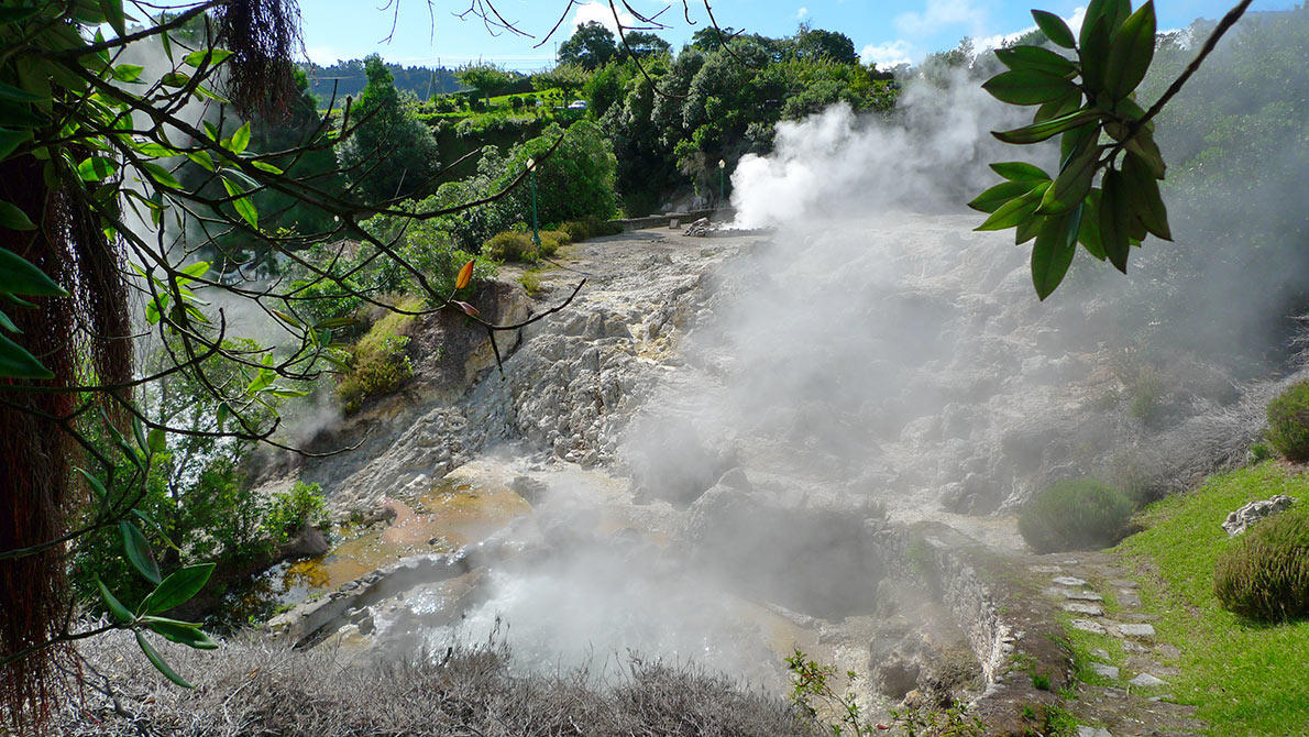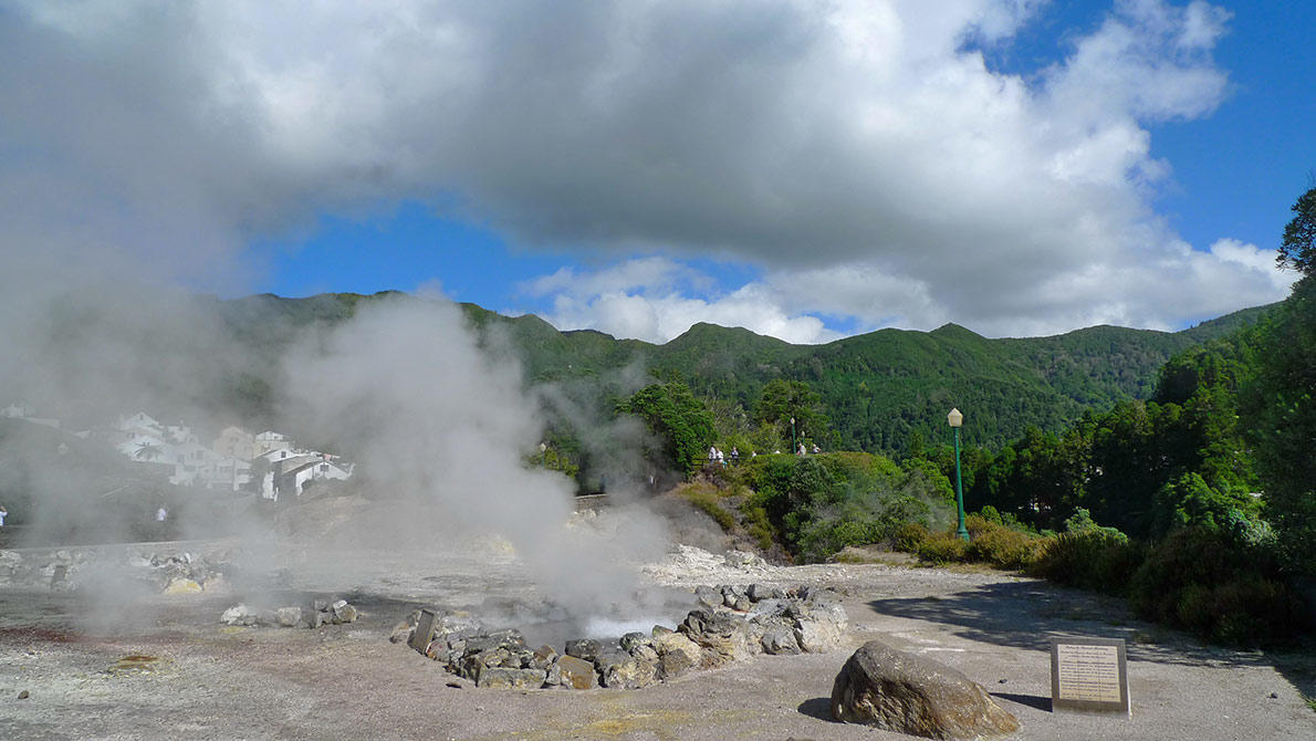 Имеющиеся исторические документы показывают, что первые поселенцы Сан-Мигеля, высадившиеся в районе нынешней деревни Поваосан в период между 1439 и 1443 годами, в течение года наблюдали важные земные явления. Они были напуганы бесчисленными землетрясениями, шумом, вспышками и языками огня из котла Фурнаш. Колдейра (Caldeiras)- в переводе Котёл. А в 1630 году произошло крупное извержение вулкана, которое и сформировало две калдейры, в которых вы сейчас и стоите)) А вершиной стал Пико ду Гаспар к востоку от кальдерного озера Лагоа дас Фурнаш.