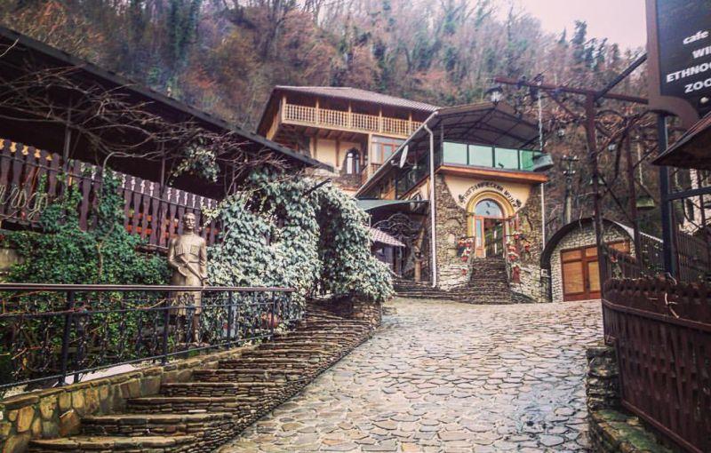 "Амшенский двор" находится на улице Краснофлотская, в тихом спокойном месте среди ущелий, на берегу реки