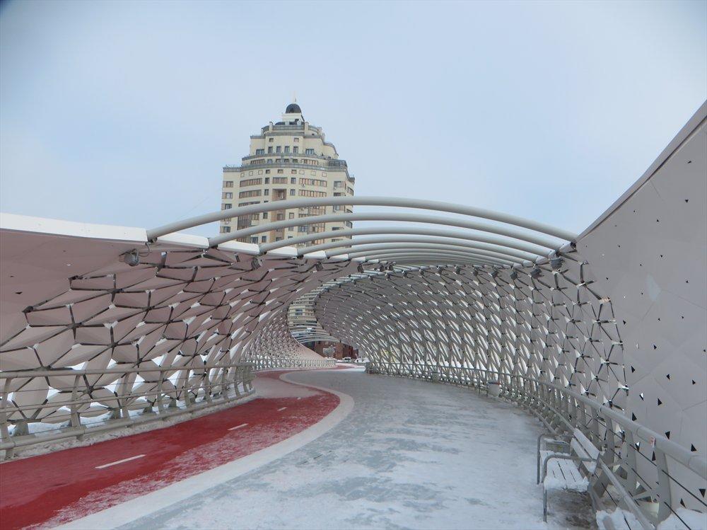 Мост спроектирован в стиле биотек - это когда используются органические природные формы в архитектуре. В оболочке моста - узор «цветок жизни», который отвечает закону Фибоначчи, известный также как золотое сечение.