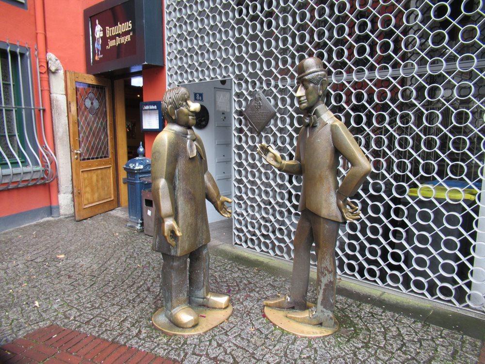 Первая интересная современная скульптура. Два противоположных типажа. Это якобы два персонажа, которые когда-то жили в доме, рядом с которым теперь стоят их изваяния. Один худой и высокий, другой маленький и толстый, а зовут их Тюннес и Шель (Tünnes und Schäl). Это герои кёльнского кукольного театра, герои местного фольклора и анекдотов. Тюннес — тот, что потолще (он здравомыслящий, добродушный, деревенский простак), Шель — тот, что потоньше (по характеру: продувной, хитрый тип, пройдоха в пиджаке). Говорят, что эти персонажи отражают личностные черты, свойственные жителям Кёльна, и в каждом кельнце живут и Тюннес, и Шель. Считается, что если забраться ногами на их ботинки и подержать за нос — сначала одного, а потом другого, то будет счастье. Не верите? Посмотрите на носы и башмаки наших героев. Видите – они начищены до блеска.