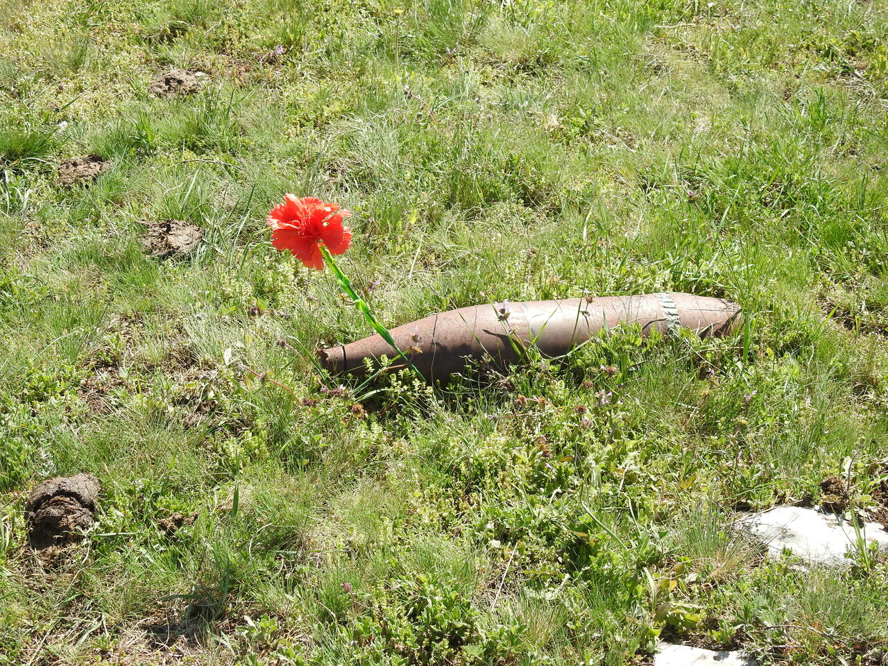Вокруг много памятников. Земля эта видела много сражений и героизма ее защитников. Найти здесь осколок, гильзу, ржавый хвост от минометной мины — обычное дело. На памятнике неподалеку — целый склад таких находок. Мы сами нашли по пути пару учебных боеприпасов, случайно залетевших сюда с полигона в Перевальном.