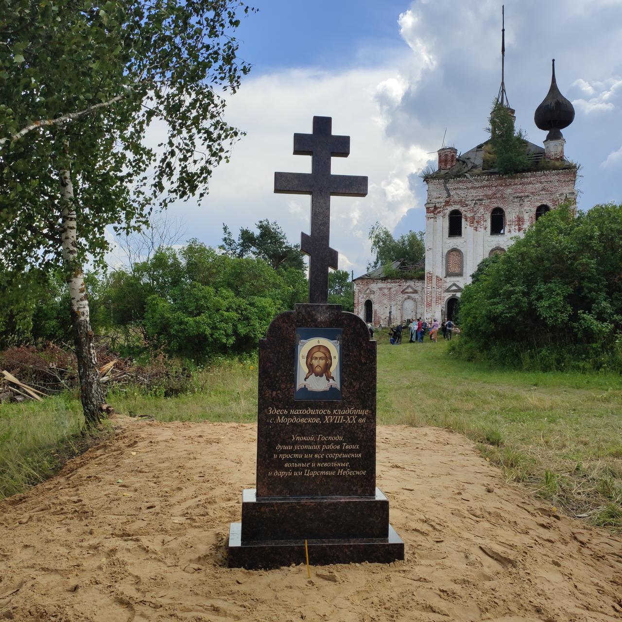Отдельно пару слов хочу рассказать о церковном кладбище, существовавшем здесь примерно до середины XX века. В его ограде были похоронены многие поколения местных жителей (в том числе и мои предки), но по решению председателя колхоза в одночасье все памятники были снесены и использованы при строительстве фундамента местного клуба. Когда я впервые приехал в село, о существовании кладбища говорили лишь несколько чудом сохранившихся в кустах за храмом надгробных плит, да воспоминания старожил. В ходе поисков в архивах мне удалось документально подтвердить его существование, ориентировочно установить границы и, даже, найти дореволюционные фотографии.