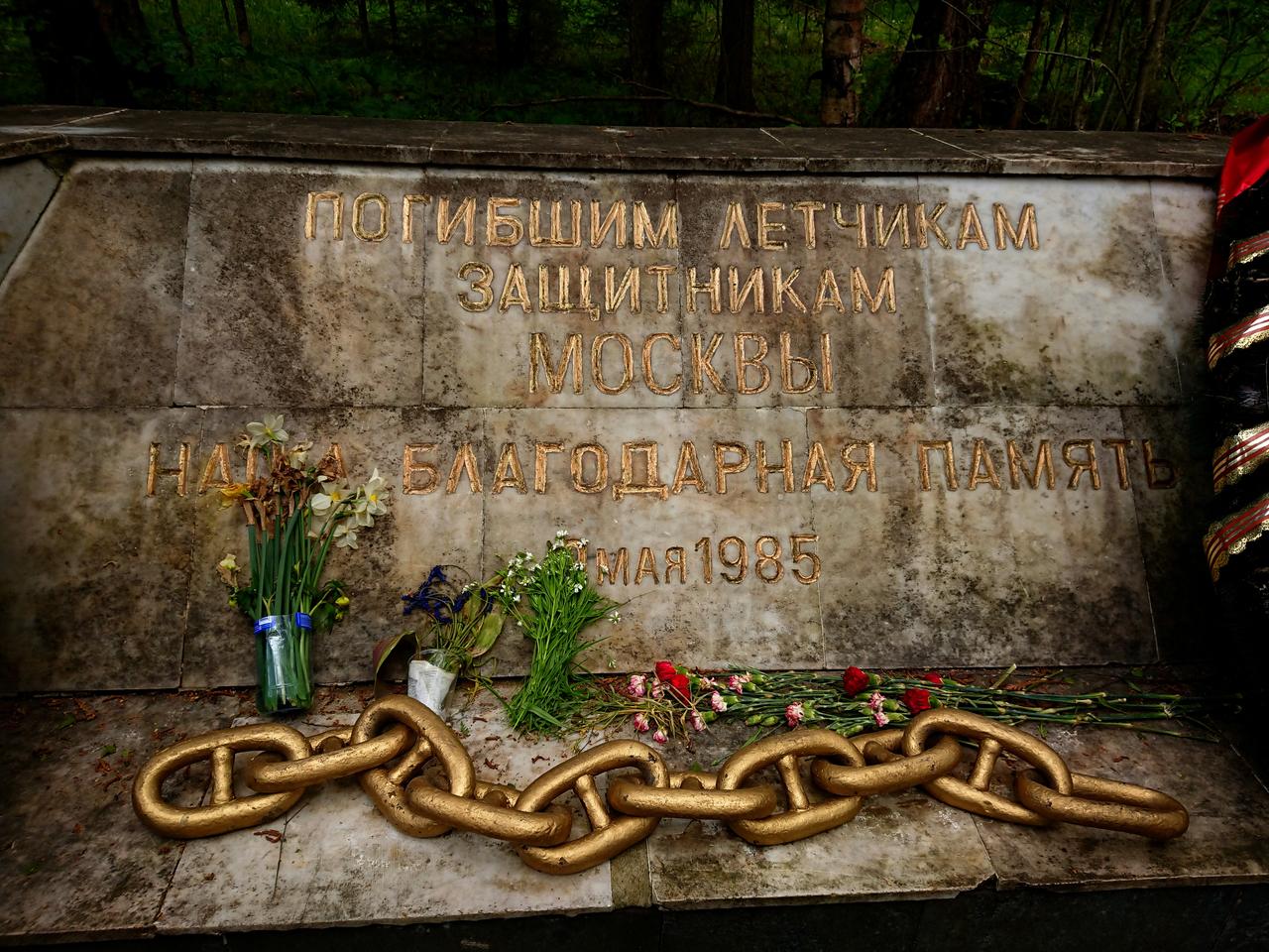 К 40-летию Победы, в 1985 году, здесь возвели монумент в том виде, как мы можем видеть его и сейчас. Плита гласит: «Погибшим лётчикам – защитникам Москвы наша благодарная память». Рядом расположен стенд, сообщающий, что здесь же похоронен и лётчик Лепёшкин. Источник 1987 года говорит, что «Бывшее надгробие разобрали и остатки самолета, участвовавшего в боях зимой-осенью 1941 г., перенесли к новому мемориалу. Табличка же с фамилией была просто приставлена к бортику».
