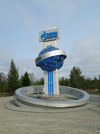 Стела Газпром Добыча Уренгой - Этот памятник расположен недалеко от административного здания Газпрома, выбор места был не случайным, именно здесь расположена 66 – я параллель, так сказать условная линия, за которой начинается территория Полярного круга. Раньше на этом месте был установлен памятник, местные жители и гости Нового Уренгоя, приходили сюда, чтобы совершать различные обряды, или загадывать желание. Очень часто сюда приходили молодожены, чтобы завязать ленточку и сделать памятные фотографии. И вот, спустя несколько лет, старый памятник сменил новый.