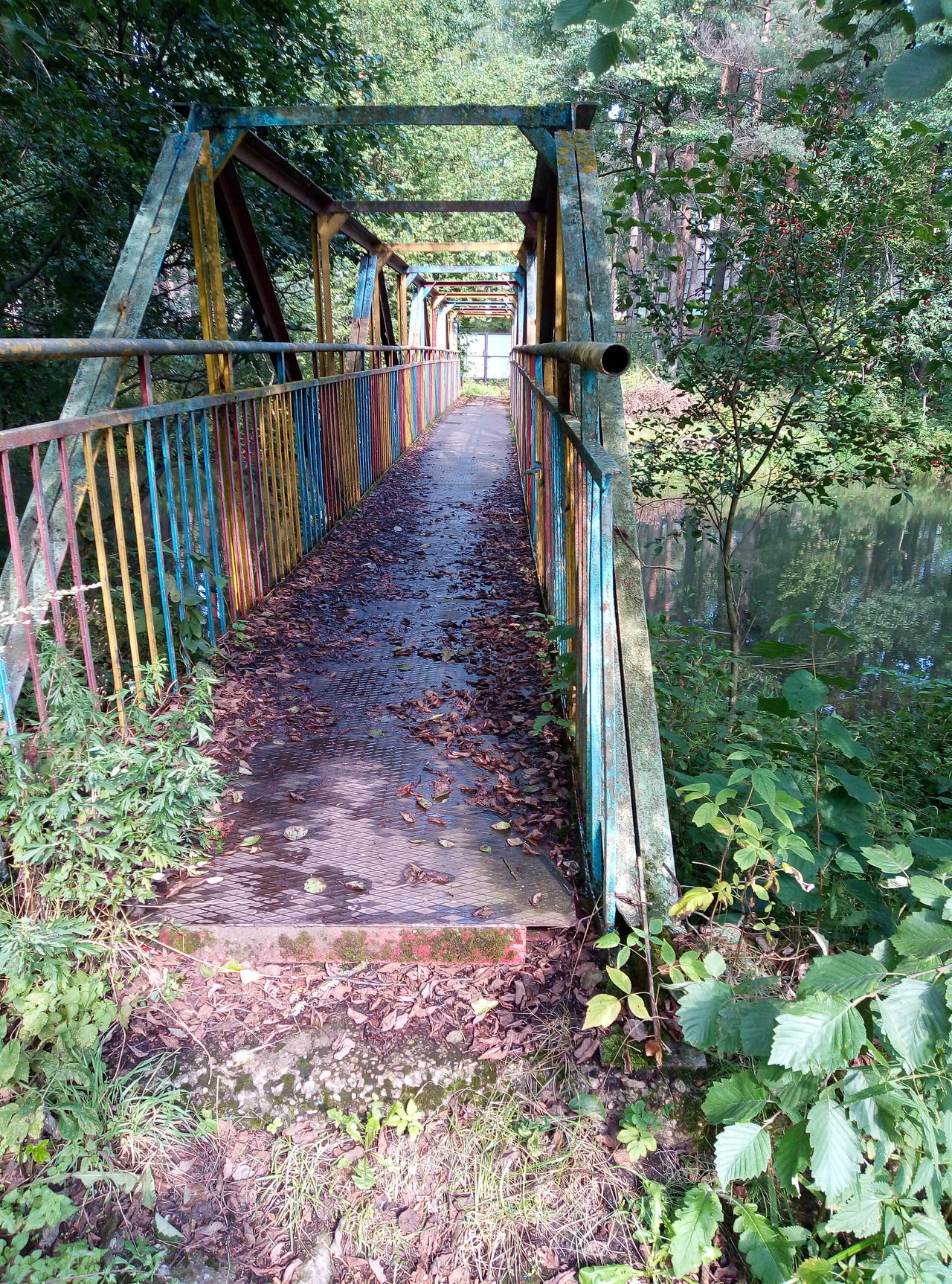 Речка Рыбинка живописно завалена деревьями. Объезжая их как-раз за пол часика до моста и доплываешь. Пешеходная прогулка до моста оказалось намного сложней и трудней. Запутался в санаториях и детских оздоровительных лагерях. Очень понравилось незавершенный и тихий экстрим. Пешеходный мост идеально подобран как концовка водной прогулки. Другими словами при взятии клада предлагаю прогулку от санатория "Сосновый бор" до "Богатыря" на любом виде эко-транспорта: пешком, на велосипеде, на катамаране. В сосновом бору и велосипед можно взять на прокат. Заодно предлагаю съездить за ещё одним кладом.