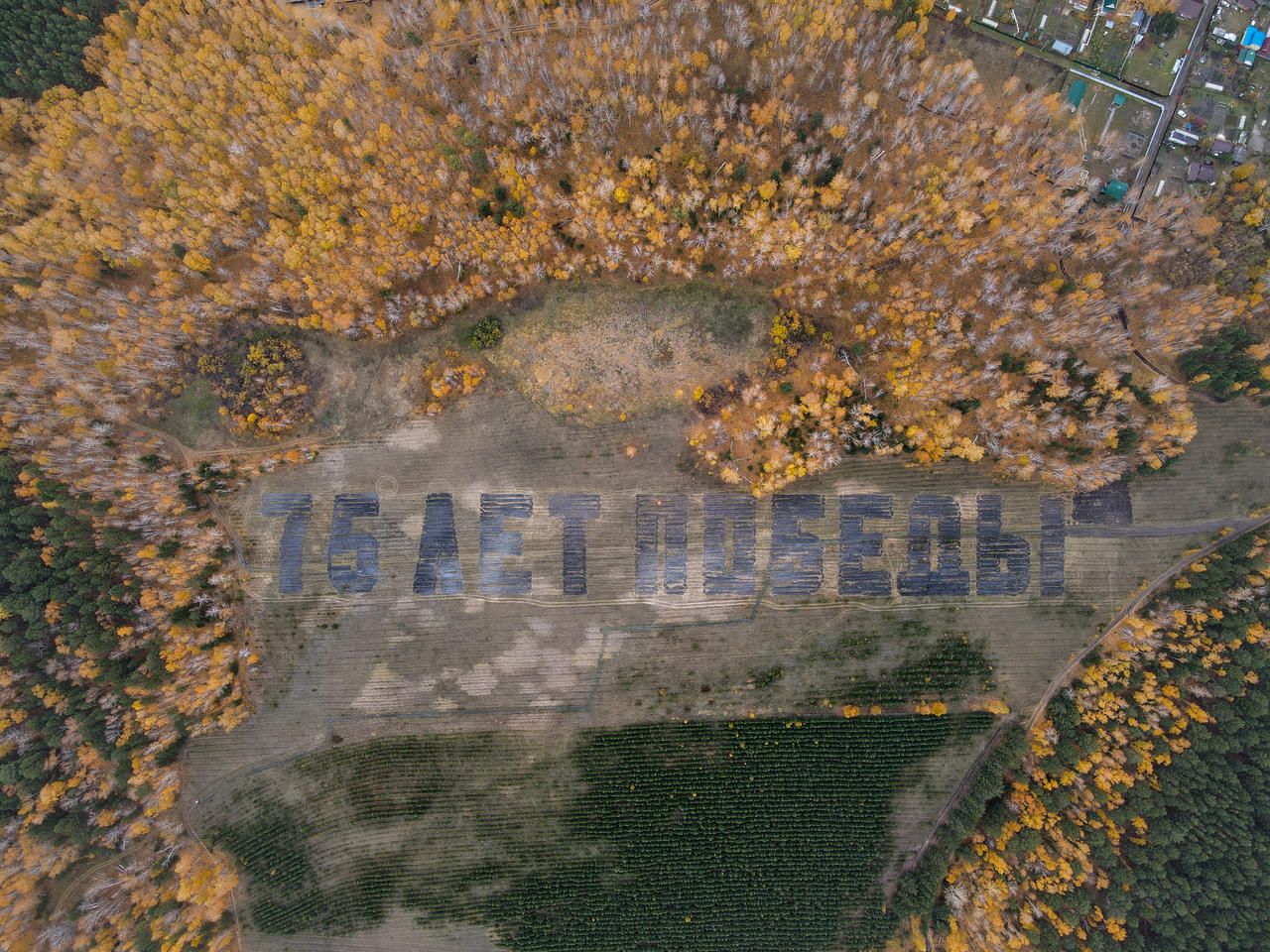 На сей раз, надпись приурочена к празднованию 75-летия Победы в Великой Отечественной войне. Надпись эта в память о погибших за Отечество, коих в каждой семье России немало. Несколько тысяч саженцев сосны были высажены 2 октября 2020 года лесниками и волонтерами недалеко от поселка Придорожный Кетовского района Курганской области. Геоглиф заложен в рамках всероссийской акции «Сохраним лес». Планируется, что эта акция поможет восстановить леса, которые гибнут во время пожаров.