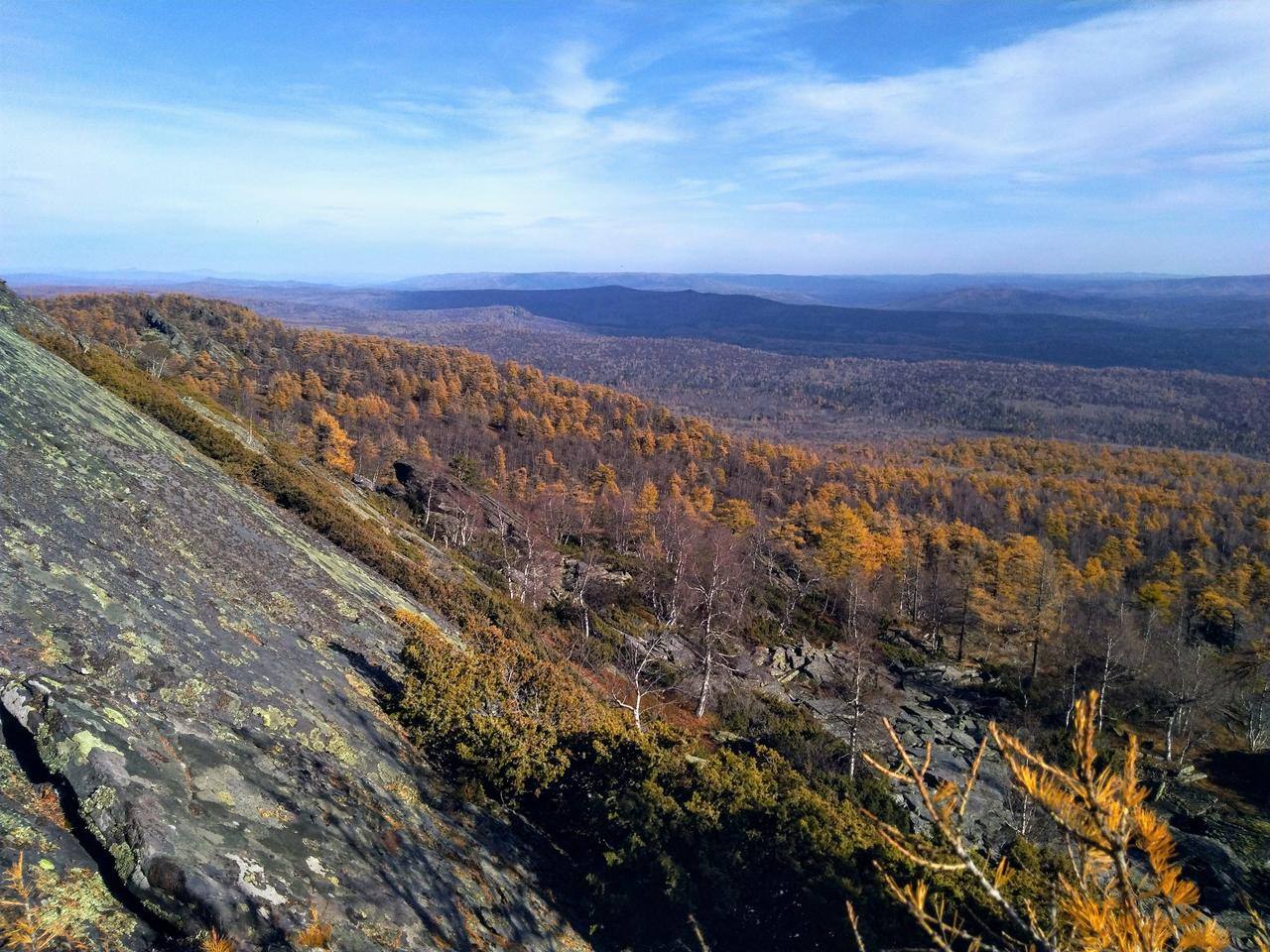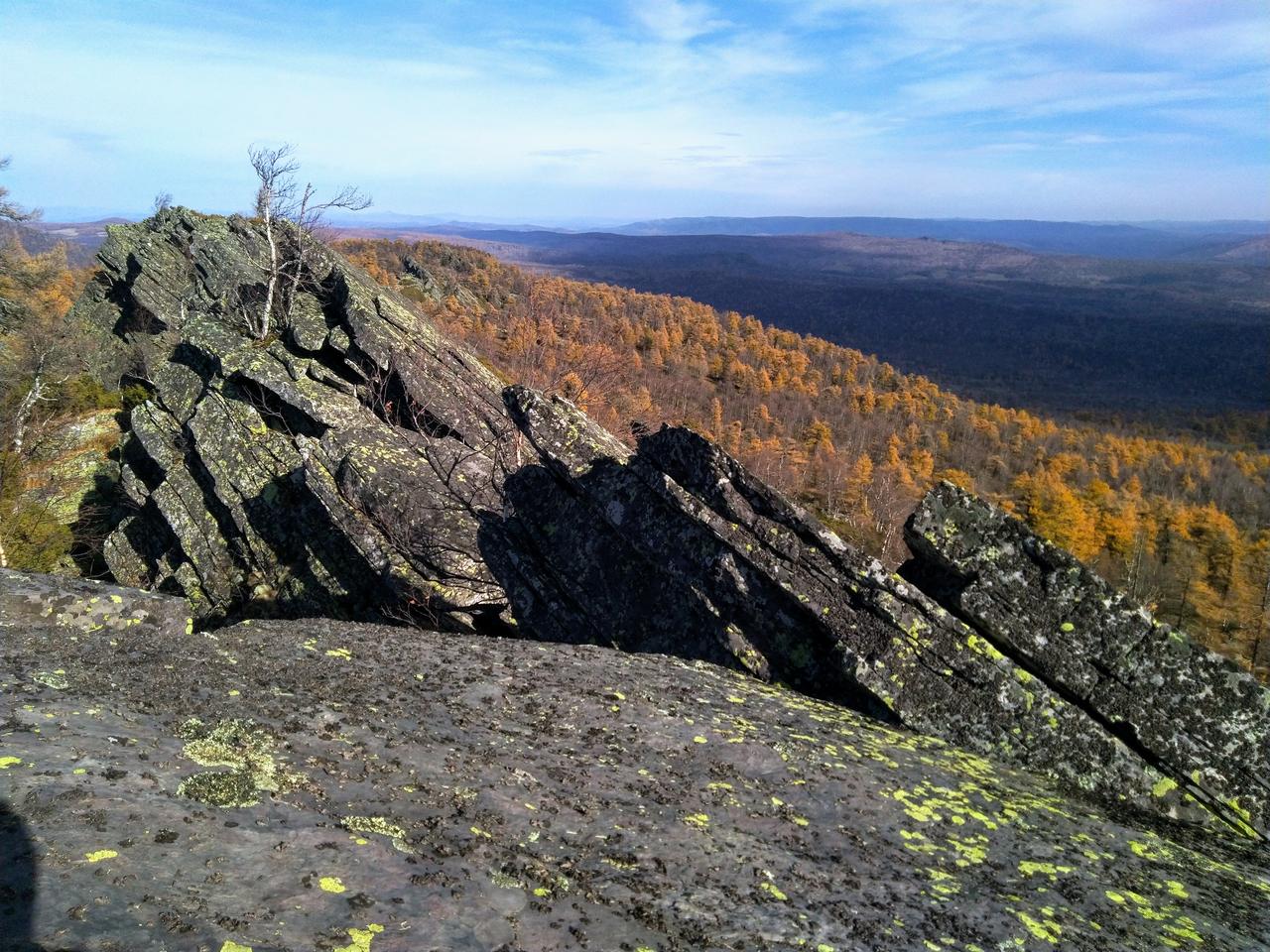 С вершины открывается прекрасный вид. Можно разглядеть Большой Шатак (не удивительно), Большой Ямантау, Кирель, Малиновую, Ялангас, краешек Белорецка, Краку (и торчащий из-за неё Арвякрязь) и ещё большое количество вершин, которые я не смог распознать.