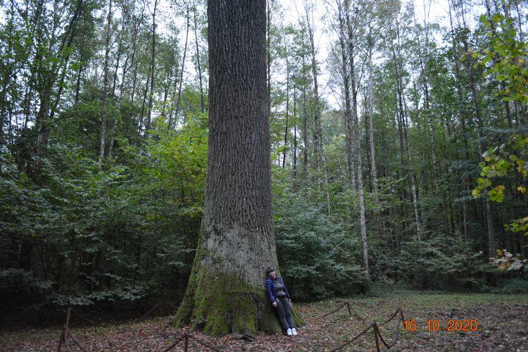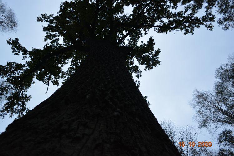 Говорят, что на стволе дуба остались старые следы от пилы. Когда-то дерево пытались срезать, но великан не поддался.