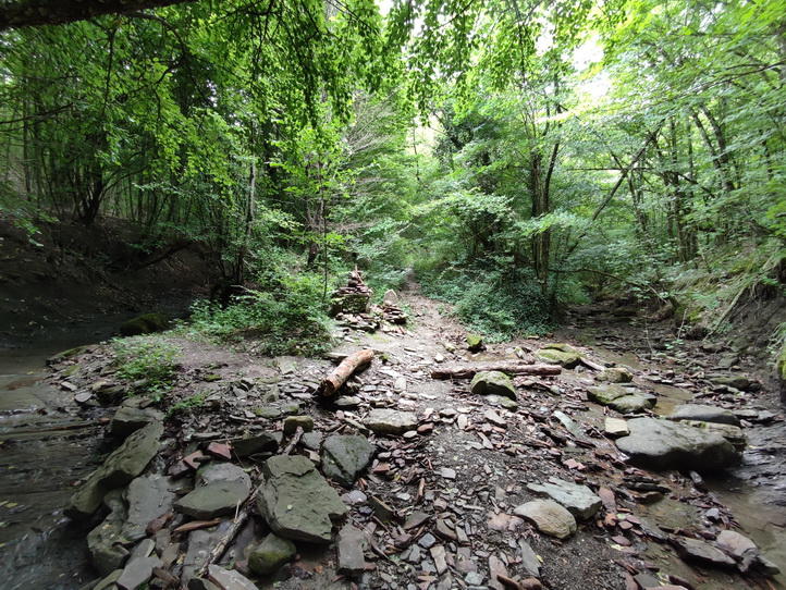 Наиболее простая дорога на гору начинается прямо от посёлка, буквально за первым бродом, который можно переехать на машине, либо воспользоваться пешеходным мостиком рядом. Координаты начала пути: N44 28.905, E38 24.436. Дорога идёт вдоль реки Щель Скупкова, местами спускаясь прямо в русло, а иногда уходя тропкой на соседний склон в обход какого-либо препятствия. В месте, где русло раздваивается, нужно продолжать двигаться прямо в гору, есть указатель. Ничего сложного там нет, подъём плавный, даже ребёнок дойдёт. Кстати, тропа прорисована в OSM, так что заблудиться очень сложно. Во время подъёма, слева от дороги Вам встретится большой овальный камень, который местные называют "Мозг", но нам он почему-то больше кофейное зёрнышко напомнил. По легенде, если на нём посидеть или полежать, то ума прибавится))).