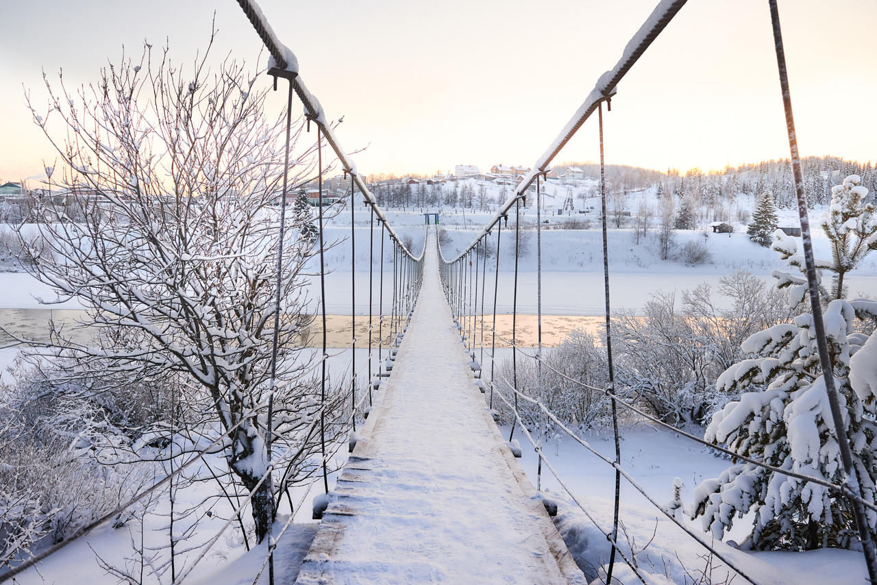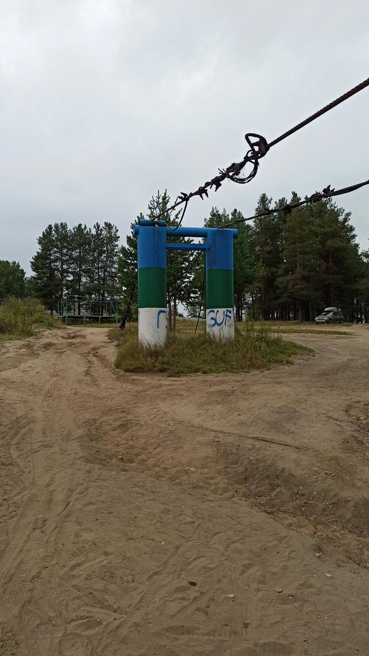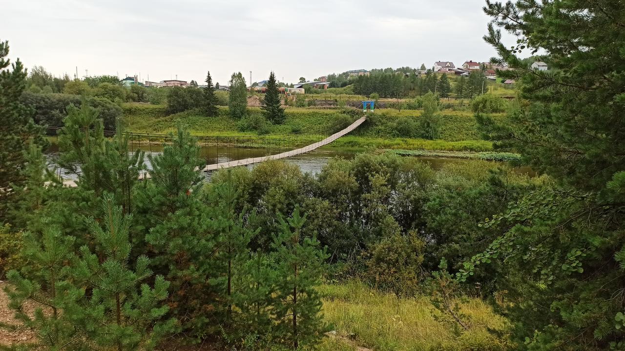 Тайник здесь создан в основном из-за ландшафтной красоты устья реки. Гордость села – длинный подвесной мост над Ухтой. Он активно используется жителями, чтобы попасть в промышленный район города, на железнодорожный узел. Берег у моста высокий сосновый. Но закладывать коробочку я не стал. Вместо этого предлагаю вам прогуляться по мосту туда и сюда.