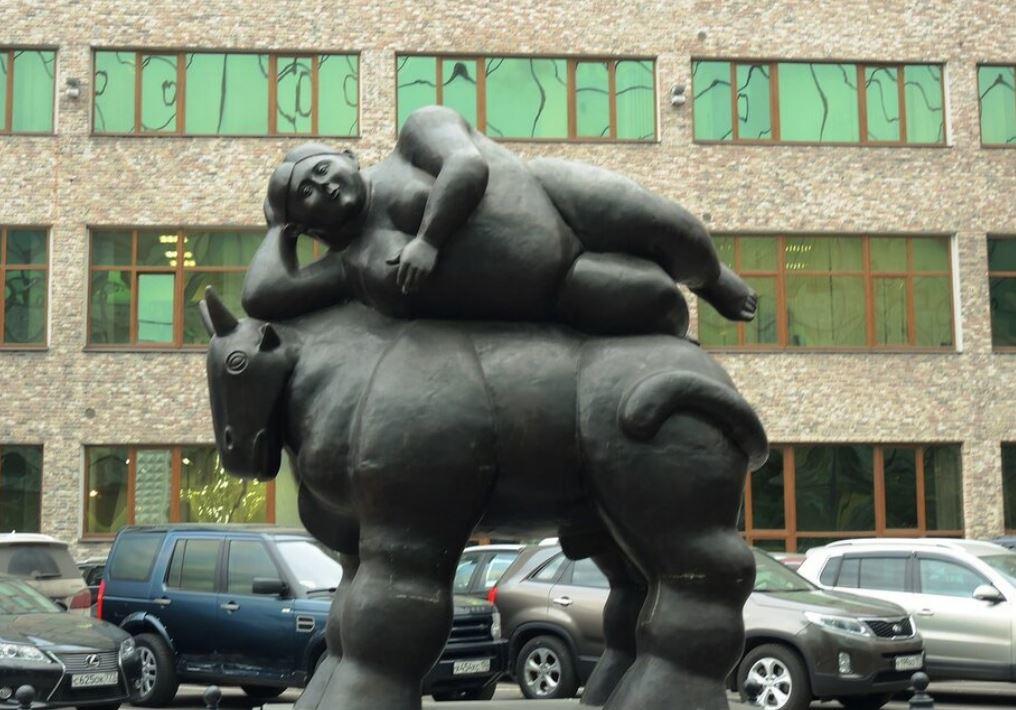 Одной из самых известных его скульптур в жанре фигуратизма является «Похищение Европы». Скульптура выполнена в гротескном стиле. Есть и версия Ботеро в живописи (1995 год). В Москве я видел уже 3 такие скульптуры – у бизнес-центров «Порт-Плаза» (Технопарк), W-Plaza (Тульская). И третья – тут – Кунцевская версия.