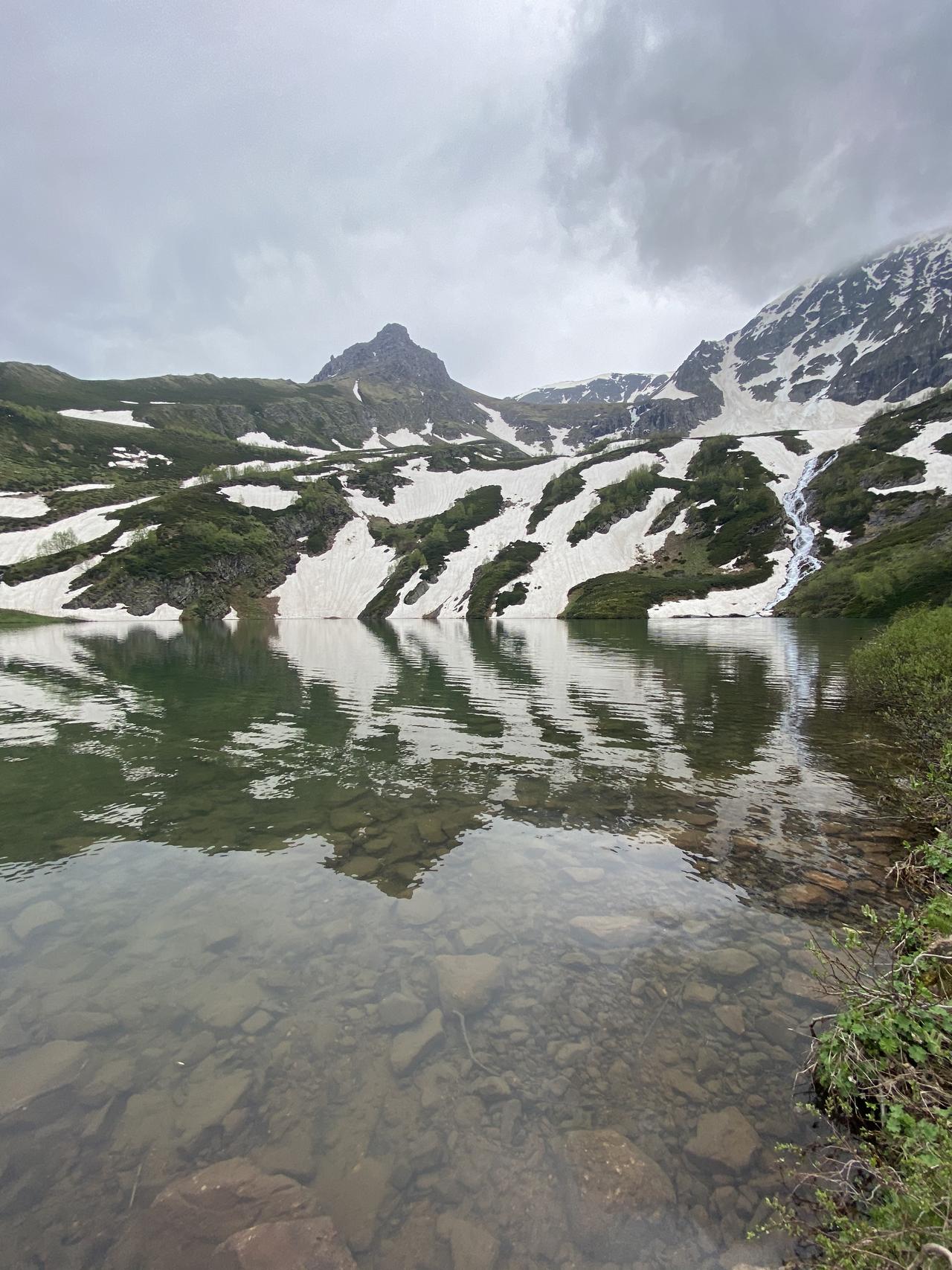 Озеро окаймляется зелеными скалистыми горами, в него впадает красивый, кажущийся снизу белым, бурный поток. Именно из-за него вода в озере слегка мутная, в отличие от большинства высокогорных озер. На заболоченном берегу озера – цветет пышная альпийская растительность. Но и места под палатку вполне предостаточно.