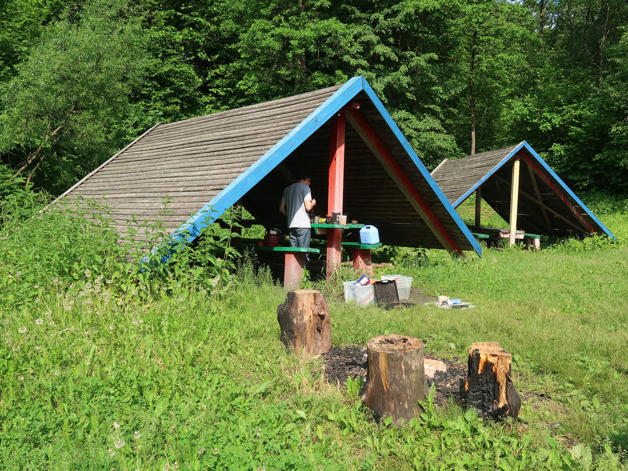 Покушав и досконально исследовав территорию источника, мы отправились искать место для тайника. И над источником в сосновом лесу обнаружили расчудеснейшую поляну среди сосен с ещё одной беседкой! Эх, если бы мы ночью свернули сюда! Но мы свернули на грунтовку напротив, в сторону Днепра, а там обнаружилось место, для временного сна не подходящее ;) =)))