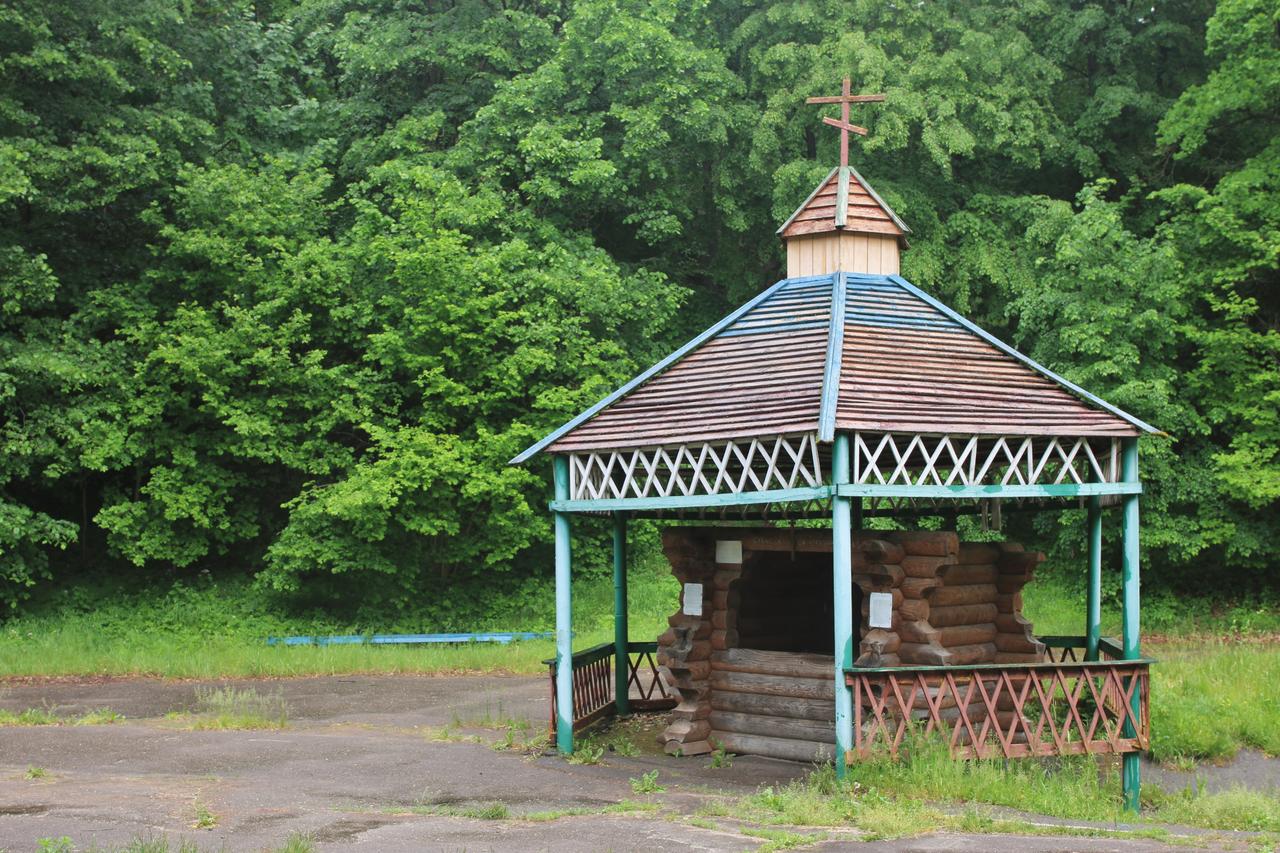 Тихо, сосны вокруг. И родник. Территория вокруг по-простому благоустроена, есть купель, стоит часовня, пара мостиков через ручей, скамеечки. И поляна, вокруг которой несколько домиков-беседок со столами, где можно устроить обед, ужин или как мы – завтрак :)