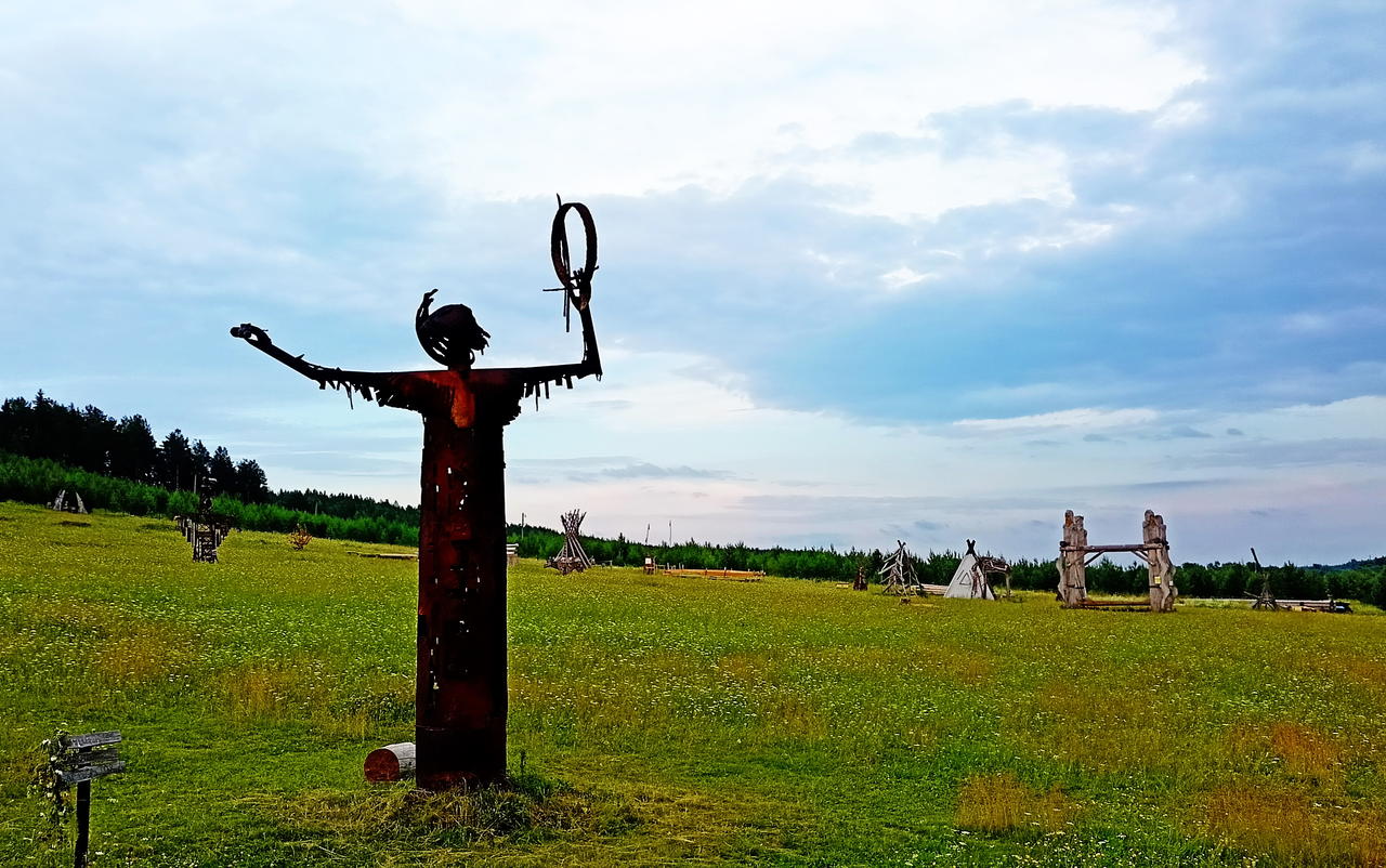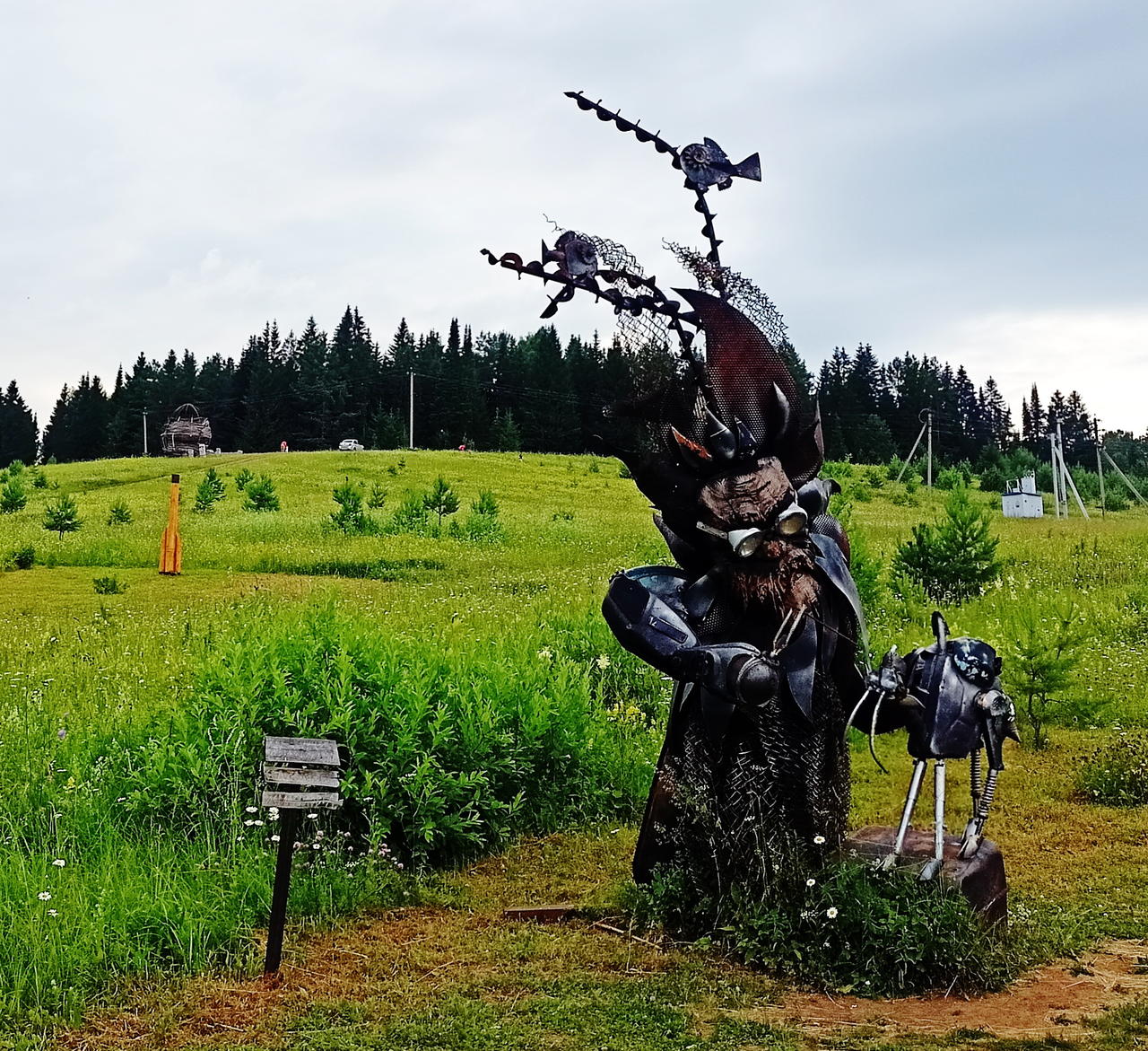 Пока же на создана входная группа - копия смотровой башни с частоколом. А на территории размещено много интересных скульптур, как деревянных, так и металлических. Всё это очень напоминает Николо-Ленивец. Хотя, конечно, масштабы поскромнее.