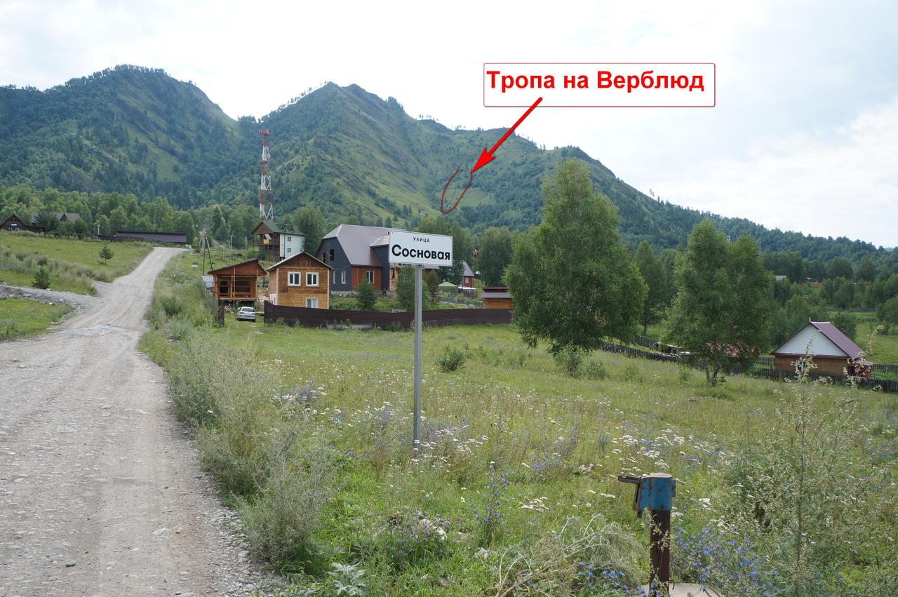 Чтобы добраться до горы, нужно двигаться из Чемала в строну ГЭС. Не доезжая ГЭС, нужно свернуть влево за гостиничным комплексом "Чемал Story". Далее улица Сосновая приведет вас к началу тропы на Верблюд. Тропу хорошо видно уже от поворота на Сосновую (см. фото).