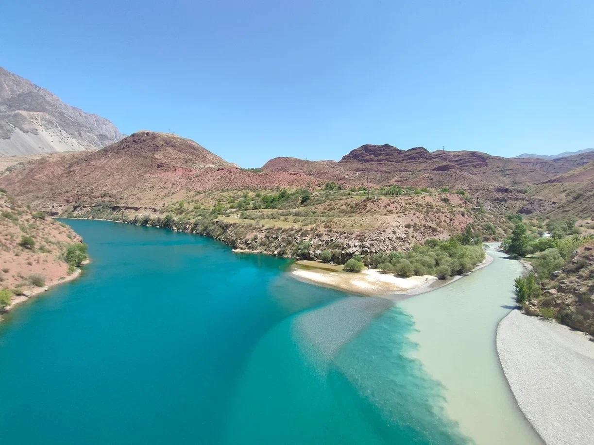 Р. Нарын - крупнейший приток р.Сырдарья, общая длинна - 807 км, пл. бассейна 59,1 км2. Если Вы едете по дороге Бишкек-Ош со стороны Бишкека - Вы её уже пересекали - Токтогульское водохранилище образовано именно водами Нарына. Однако ниже плотины этого водохранилища течение реки регулируется и вода имеет очень красивый цвет. Рядом с тайником находится мост через р.Нарын, рядом с местом впадения р.Кара-Суу и с моста прекрасно видно как перемешиваются воды рек.