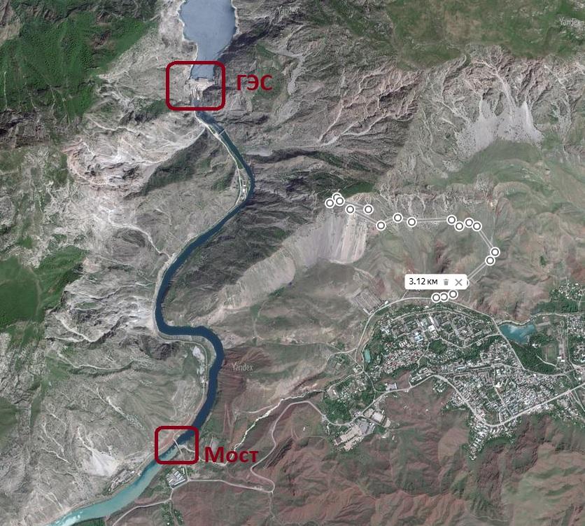 Если после моста двинуться направо - Вы упрётесь в КПП Токтогульской ГЭС, попасть без пропуска на территорию не получится, от КПП плотину не видно, поэтому посвящать ей тайник не стали. В принципе судя по информации в интернете - плотину можно увидеть от опор ЛЭП 41.646235, 72.651117 или 41.647024, 72.649089, от них - расстояние по прямой порядка 2-х километров, но мы не проверяли, поскольку до ближайших опор от асфальта - порядка 3-х км горной дороги от точки 41.637497, 72.664219 - это и время и по жаре в +35 не такое уж и простое мероприятие =). В общем в окрестностях тайника - есть плотина ГЭС, но тайник посвящен реке и мостку через неё, а не плотине.
