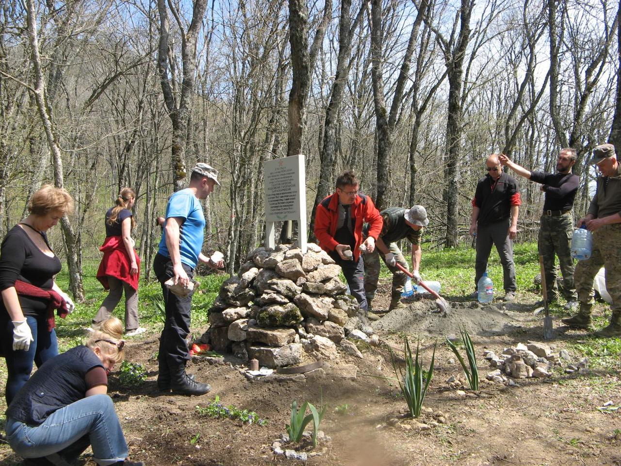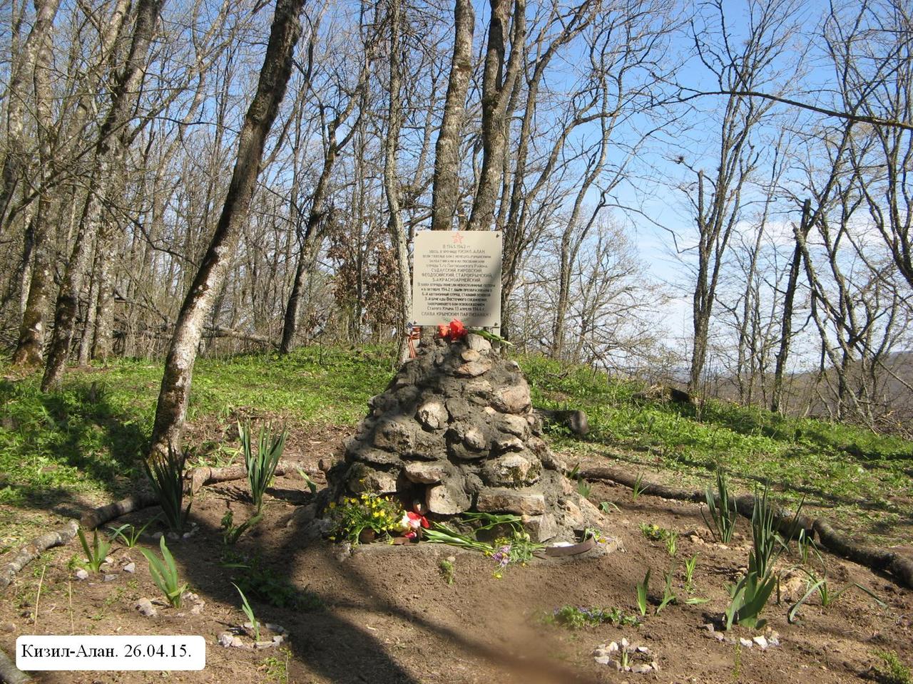 Местом базирования Судакского отряда было назначено урочище Кизил-Алан в котловине между высотами Бурус (Сугут-Оба) и Куркушлу-Оба (ныне Феодосийская), где и установлен этот памятный знак.