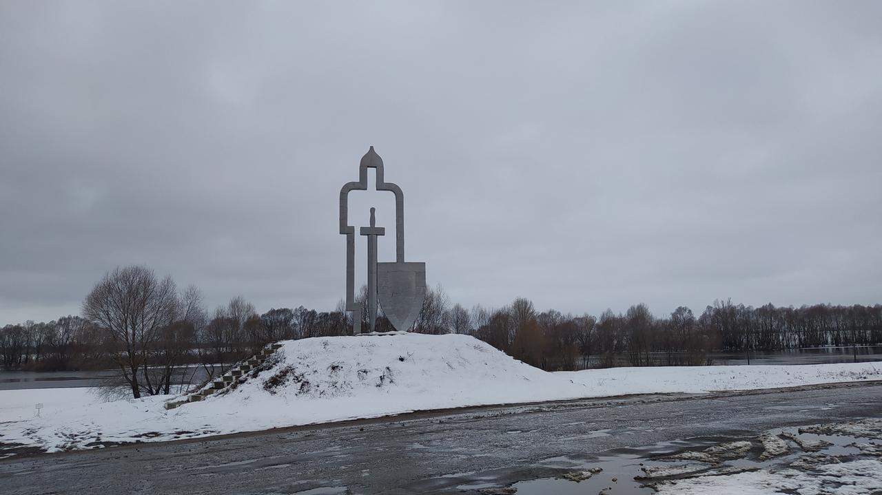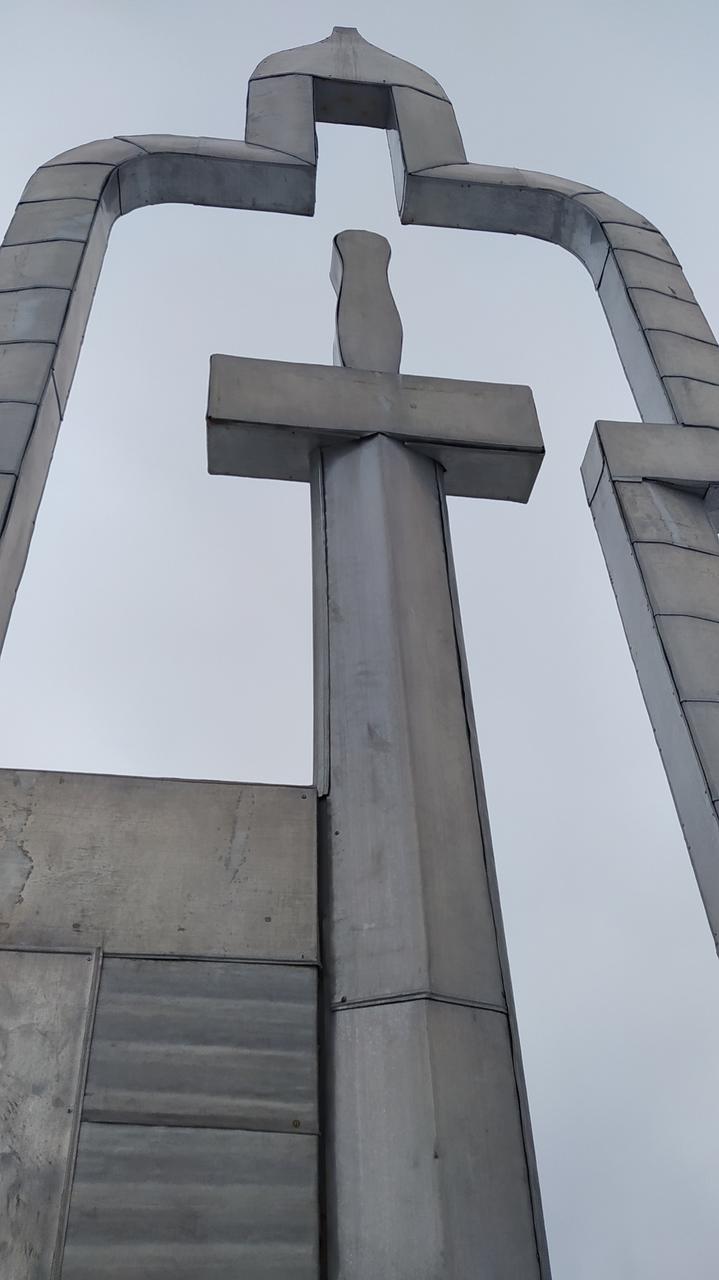 Вдохновили на такую идею ажурности слова нашего гимна, где говорится так: "И Окою сокрыт здесь доныне меч священный рязанца Добрыни". Выполняли его на крахмальном заводе и выполняли его из железных листов, обтянутых алюминием. Получился такой серебристый витязь, который встречает людей.