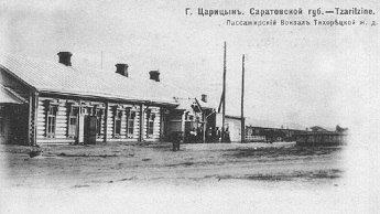 Здание пассажирского вокзала станции Царицын-Владикавказский (Тихорецкий вокзал) расположилось на окраине Зацарицынской части города и первоначально было небольшим – одноэтажным и деревянным. Фото этого здания сохранилось на открытке г. Царицына. Стены здания вокзала были бревенчатые, прямоугольные окна и двери с наличниками и сандриками. Главный вход оформлял двускатный козырёк с деревянными резными деталями. Крыша здания вокзала была двускатная, с металлической кровлей.
