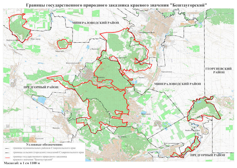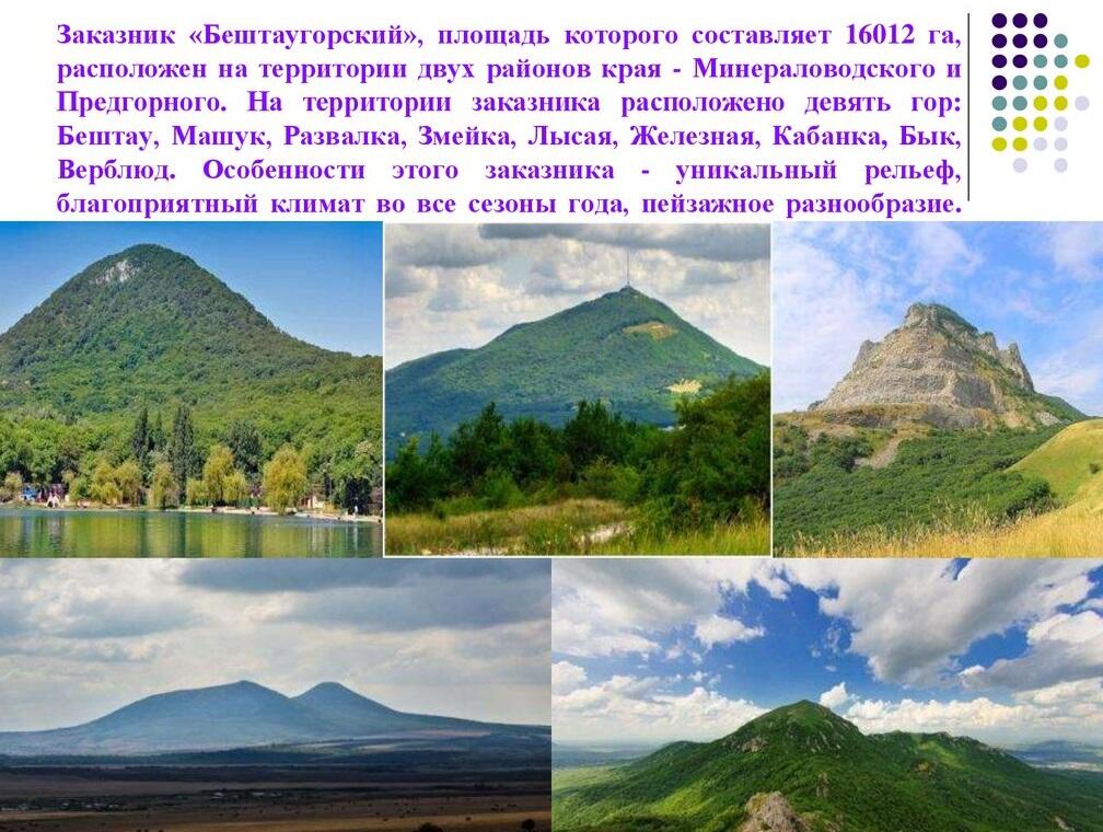 Государственный природный заказник краевого значения "Бештаугорский" расположен на территории Минераловодского района, Предгорного района, города-курорта Железноводска, города Лермонтова и города-курорта Пятигорска Ставропольского края. Площадь заказника составляет 10386,86 гектара.