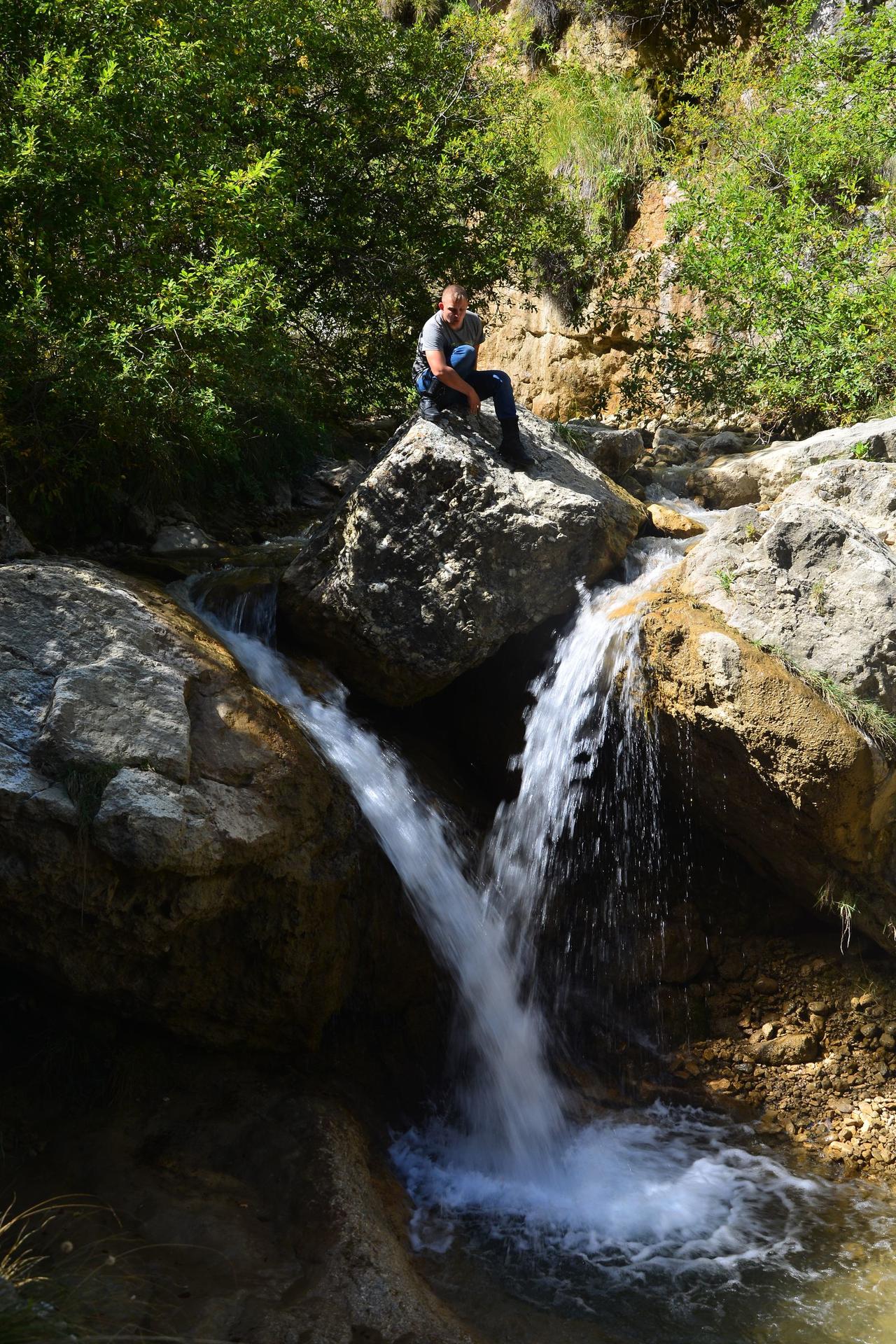 Поколесив по селу, набрав воды в роднике, продолжаем поиски. Идем по единственно возможной тропинке вдоль реки вверх по течению. К площадке, где явно стирают белье местные жители (лежало много хозяйственного мыла). Пересекаем бродик и тут начинается самое интересное. Того водопада, что искали, не нашли, зато пришли по классной необорудованной тропинке над обрывом к руинам водяной мельницы и к водопаду No name. Невысокий, метров 5-6, но со слиянием двух мощных струй воды. Раз уж названия нет, то назову его Оцолеорский по имени реки, которая его образует.