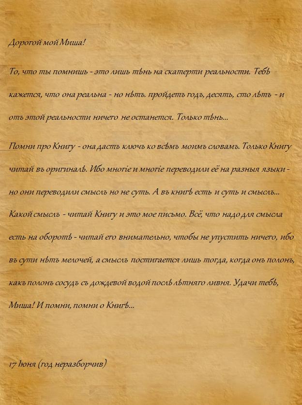 На одном из них, на старой плотной дореволюционной бумаге, с использованием дореволюционных правил орфографии, было написано: «Дорогой мой Миша! То, что ты помнишь – это лишь тень на скатерти реальности. Тебе кажется, что она реальна – но нет. Пройдет год, десять лет, сто лет – и от этой реальности ничего не останется. Только тень… Помни про Книгу – она даст ключ ко всем моим словам. Только книгу читай в оригинале. Ибо многие и многие переводили ее на разные языки – но они переводили смысл, но не суть. А в книге есть и суть, и смысл… Какой смысл – читай Книгу и это мое письмо. Все, что надо для смысла, есть на обороте – читай его внимательно, чтобы не упустить ничего, ибо в сути нет мелочей, а смысл постигается лишь тогда, когда он полон, как полон сосуд с дождевой водой после летнего ливня. Удачи тебе, Миша! И помни, помни о Книге…»