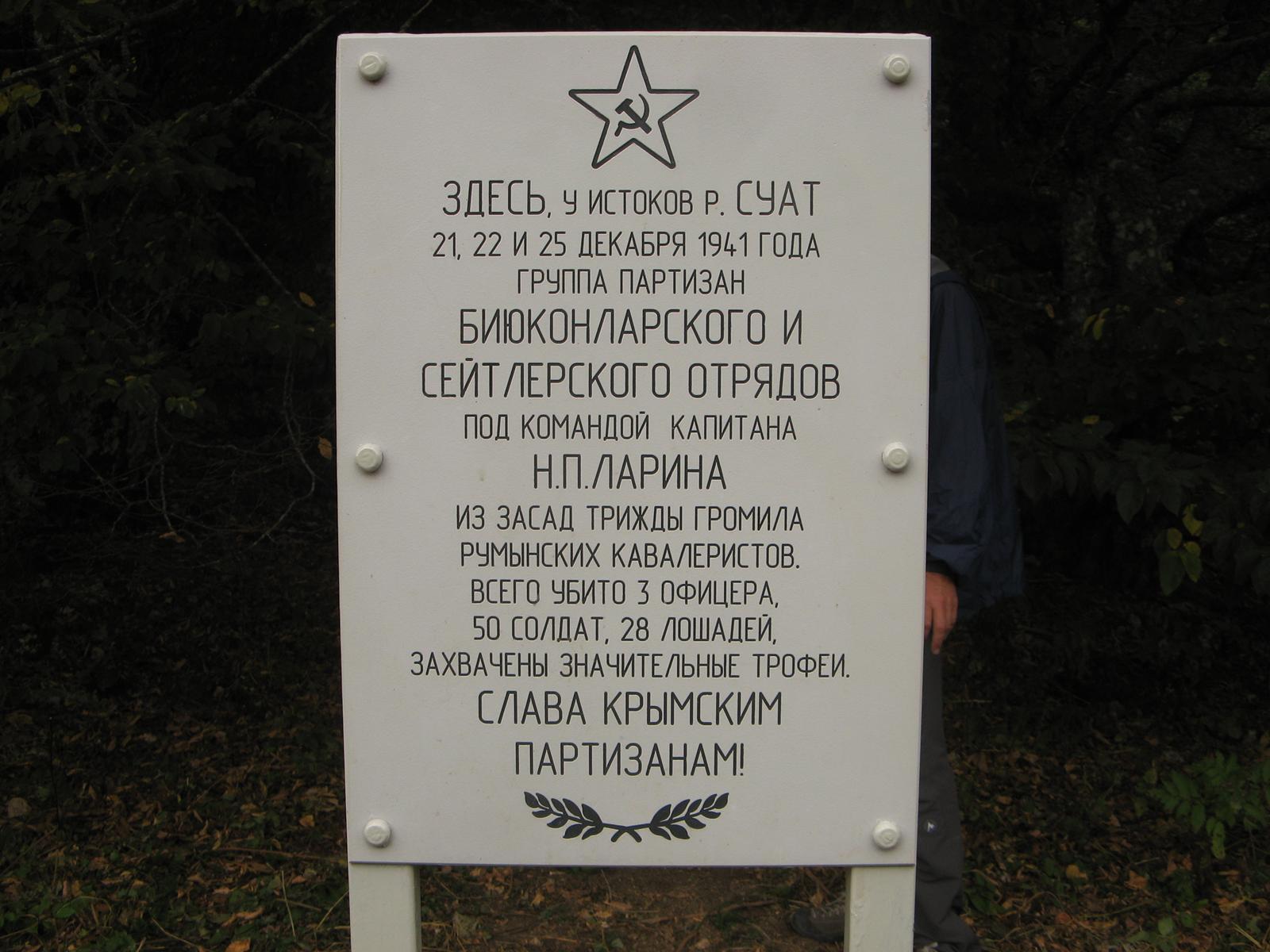 Этот памятный знак был установлен «командой Мельничука» 15.05.10 на «Румынской поляне» у истоков речки Восточный Суат. Посвящен боевым действиям Сейтлерского и Биюк-Онларского партизанских отрядов в этом районе. В декабре 41-го года фашисты стали активно «прощупывать» оборону партизанских лагерей, засылая в горы специально подготовленные подразделения горных егерей, в основном румын. И один из таких конных отрядов, численностью более двухсот человек, с притороченными к лошадям миномётами и пулемётами, появился на перевале Тырке. И тогда партизанами было принято решение: дать им такой отпор, чтобы раз и навсегда отбить охоту появляться на партизанской земле. В скалах над речкой Суат, по которой двигались румыны, боевые группы Сейтлерского и Биюк-Онларского отрядов устроили засаду. Когда егеря приблизились на расстояние ружейного выстрела, партизаны открыли по ним шквальный огонь из пулемётов, автоматов и винтовок. Конечно, это был разгром: противник оставил на снегу 50 убитых солдат, трёх офицеров, 28 лошадей и мулов, оружие. Были взяты значительные трофеи.
