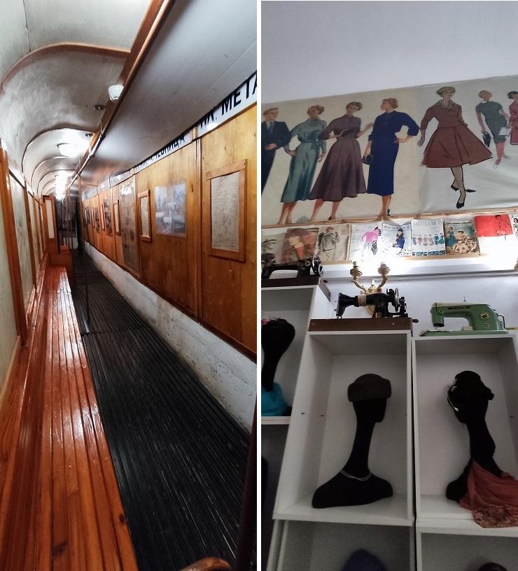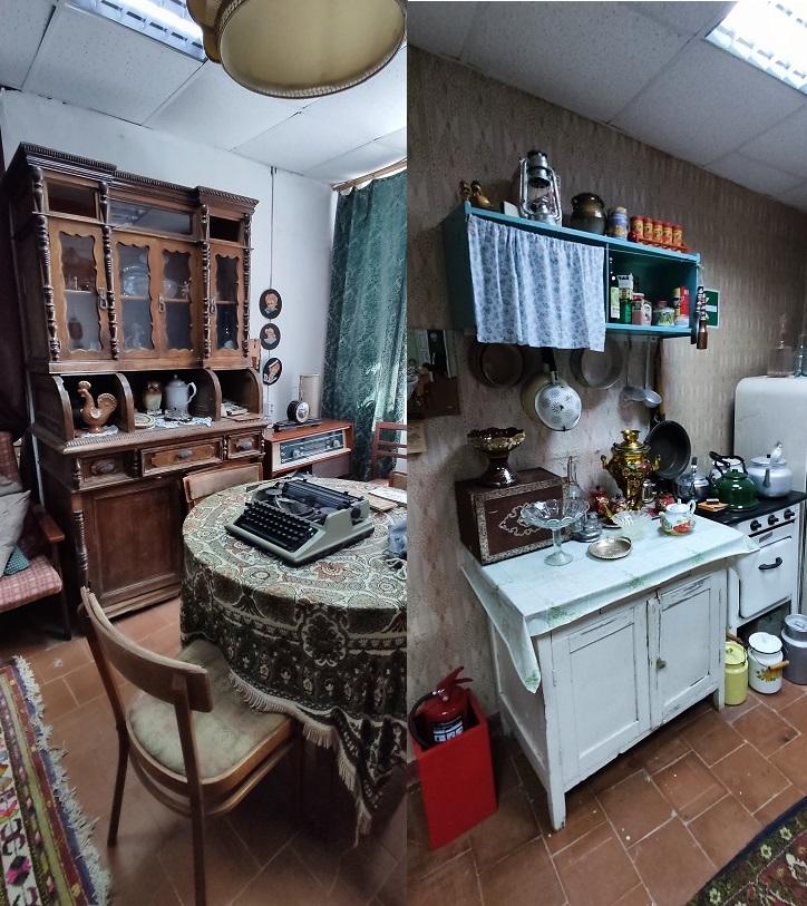 А за вторым ответом и более свежими исторически впечатлениями (кому-то возможно и из детства) -зайдите в соседний подъезд на экспозицию советского быта. Здесь устроена и самая настоящая коммунальная квартира, и швейное ателье, и фотоателье! Под лестницей уместился небольшой гараж, а через деревянные трамвайные двери попадете в настоящий старинный трамвайный вагон, в котором за заиндевевшими окнами видео-картинки той жизни, а полы и вправду ходят ходуном как в настоящем трамвае!
