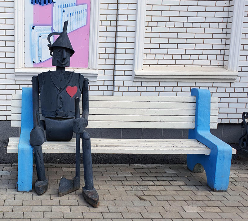 Железный дровосек из произведения Александра Волкова "Волшебник Изумрудного города" появился в Глазове. Городская скульптура размером с человеческий рост сидит на самом краю скамейки.