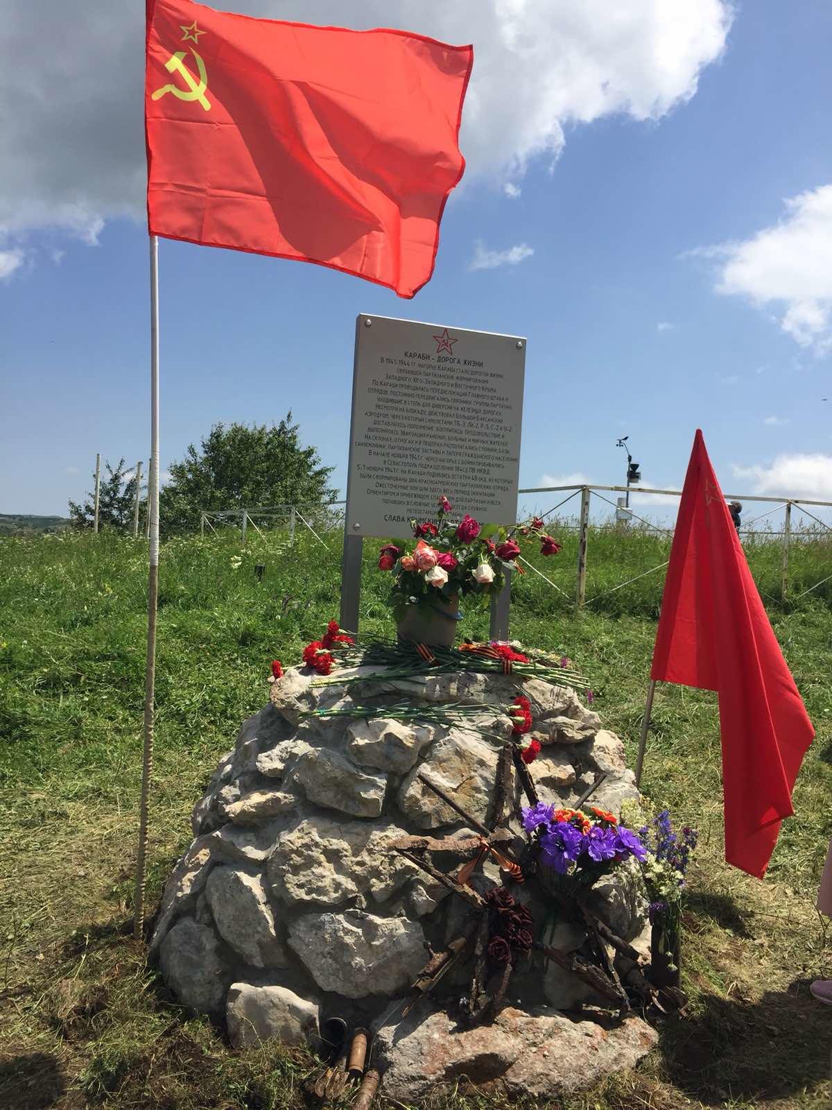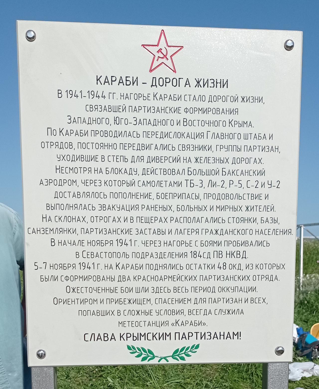 Этот памятный знак установлен 24.06.2023 г. на Караби-Яйле у метеостанции. Посвящен действиям крымских партизан в этом районе.