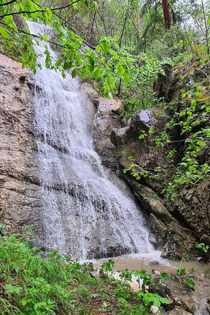 Водопад плохо просматривается с воды, так как в теплое время года его скрывают обильно растущие на склонах скал деревья и кустарники. Единственное, что выдает его это шум падающей воды, да ручей, впадающий в реку.