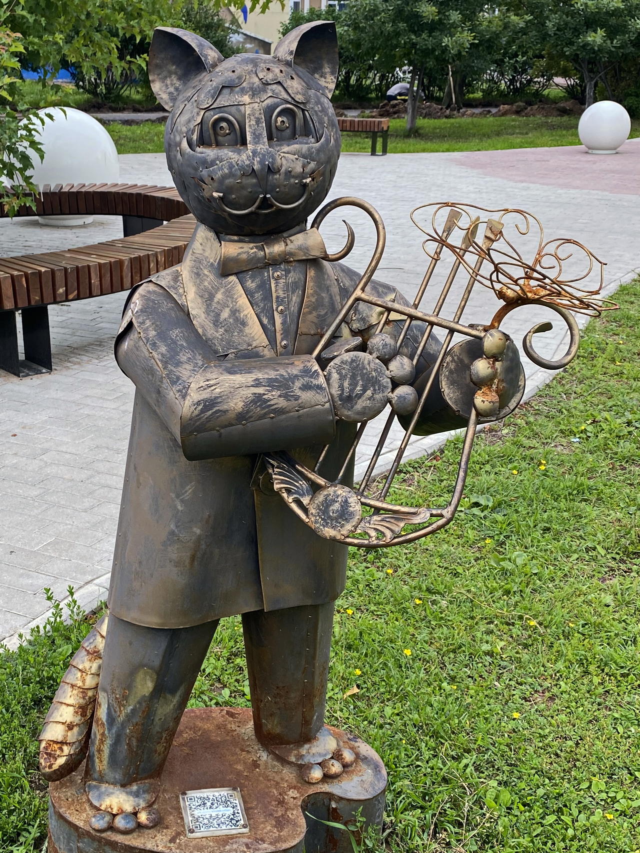 Кота-музыканта установили на пьедестал, по форме похожий на палитру художника, в 2020 году. В передних лапах кота – лира (символ творческого вдохновения, поэзии, искусства и просвещения). На лире с недавних пор сидит бабочка.