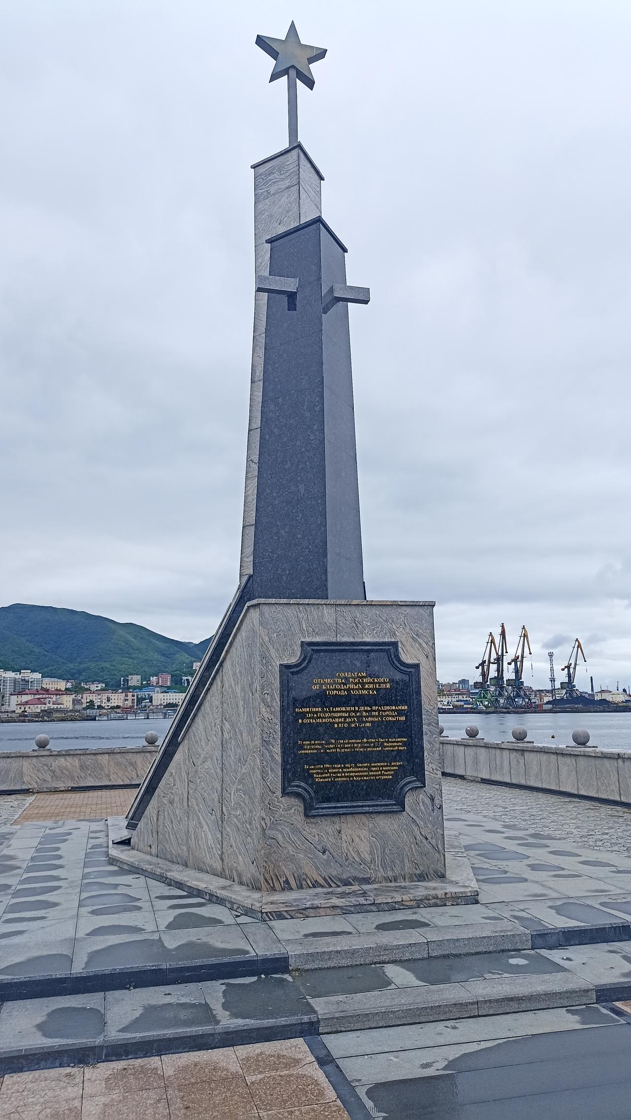 Создан на основе проекта-идеи В.А. Глушенко. Сооружение представлено в виде корабля, заходящего в порт. Венчающая комплекс звезда отражает реалии 1945 года и символизирует путеводную звезду удачи жителей города. На лицевой стороне памятника надпись: «Солдатам Отечества Российского от благодарных жителей Холмска».