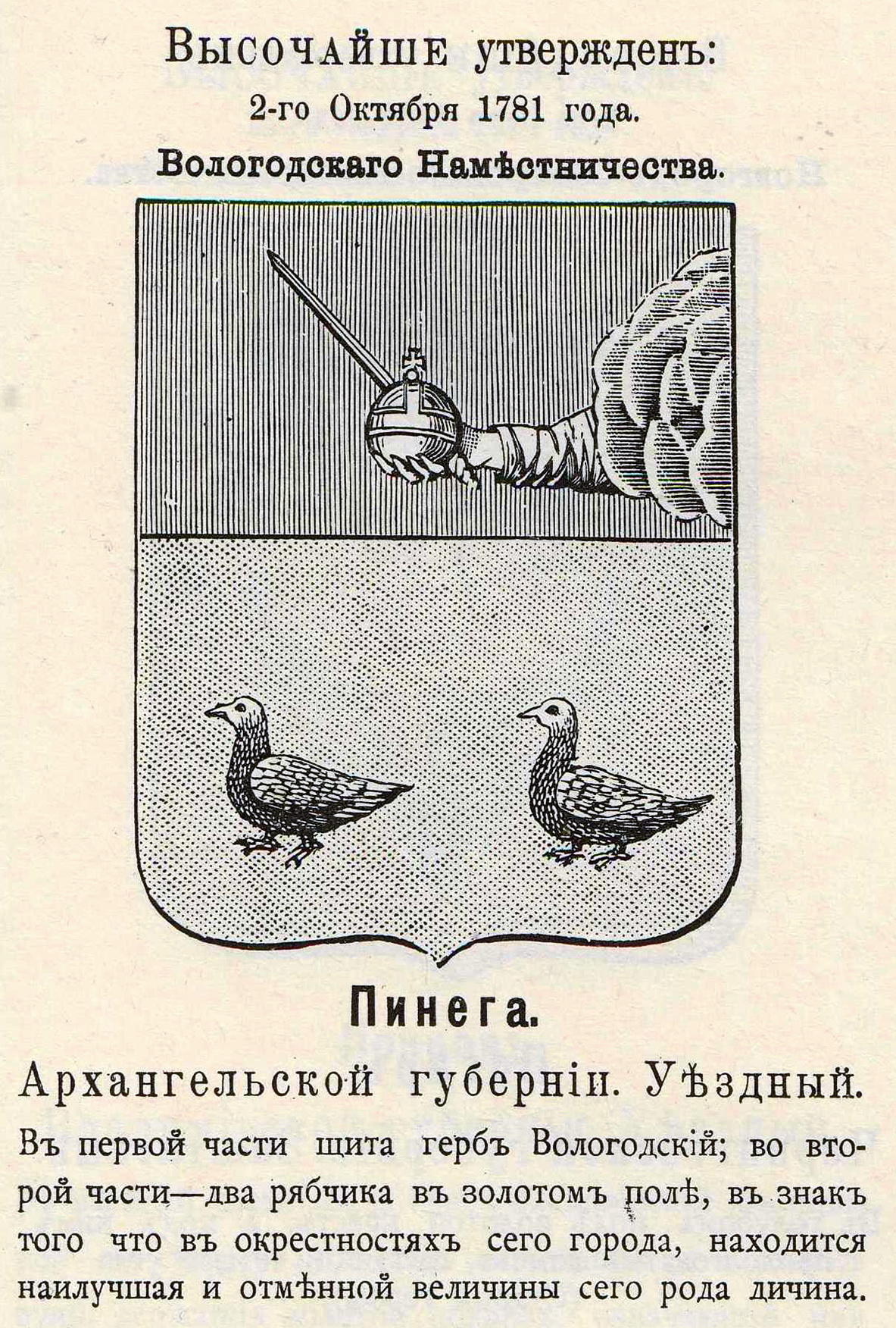 Рябчики стали отличительным признаком Пинеги 2 октября 1781 года. Екатерина Великая подписала Указ о даровании герба. Императрица вообще очень многое сделала для развития Пинеги: перенесла центр из Кевролы, учредила город, нарисовала генеральный план... Наверное, если когда-нибудь в Пинеге будет движение по установке памятников, то Екатерина II должна быть первой в очереди :)
