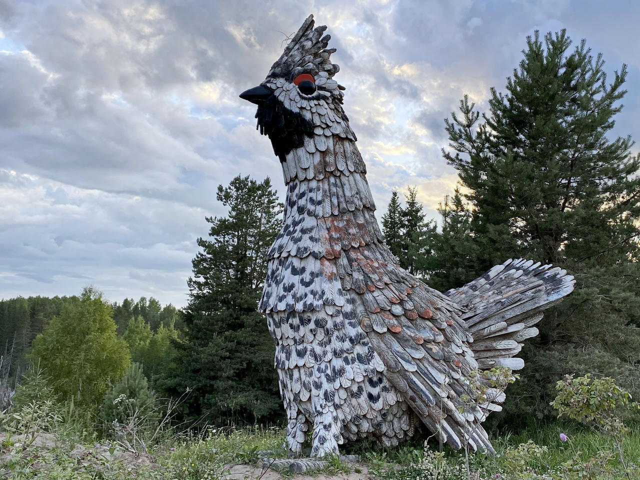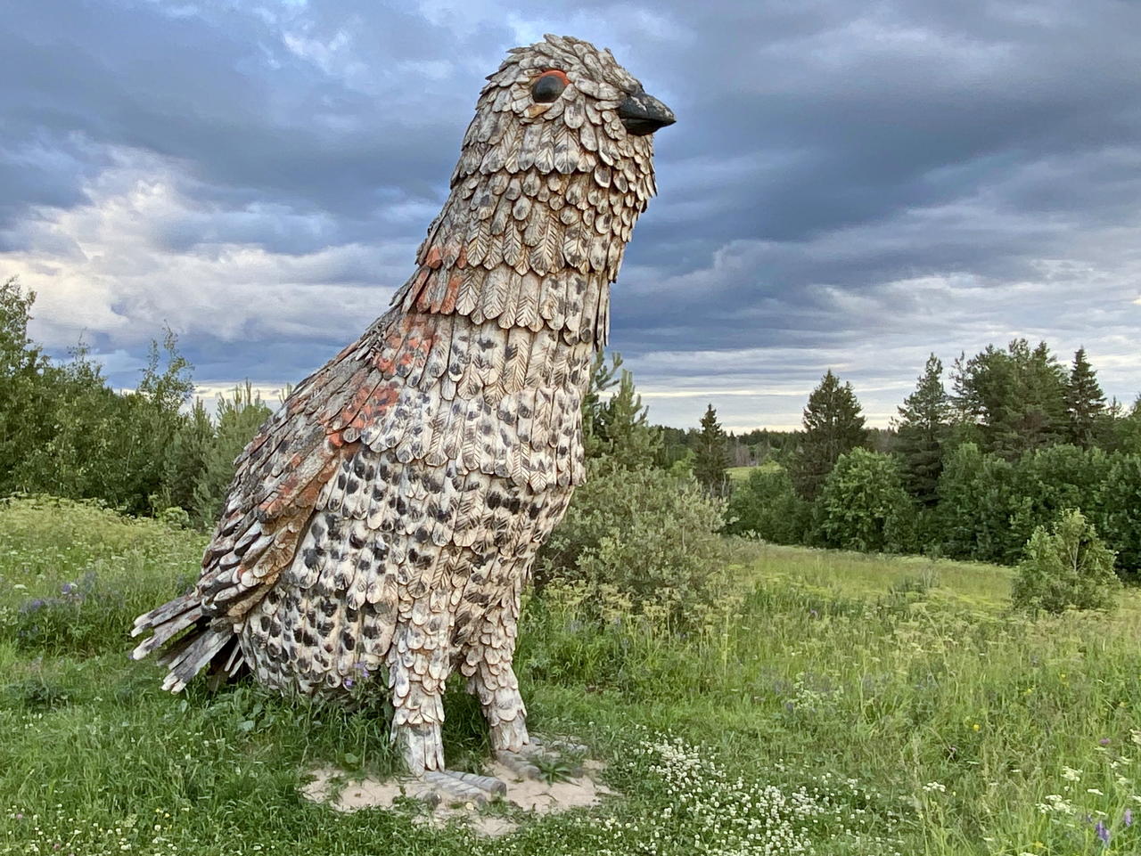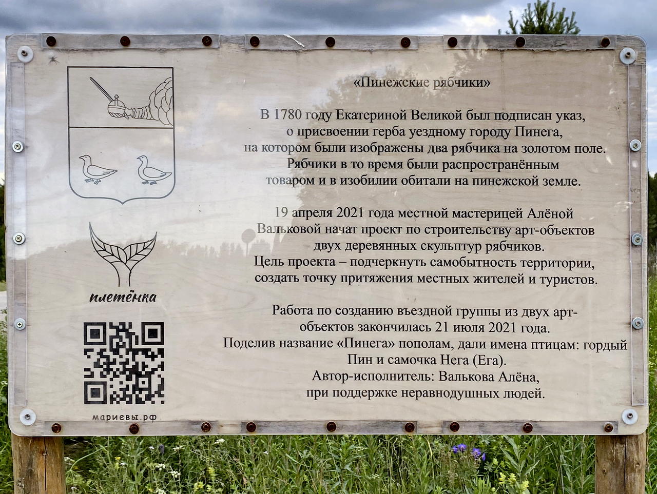 Местная мастерица со сказочным именем создаёт скульптуры из ивовых ветвей и дерева, завоёвывает победы на конкурсах арт-объектов и покоряет своими изделиями сердца людей. В 2020 году Алёну пригласила команда «Тайбола» поучаствовать в благоустройстве набережной Северной Двины. Там мастерица впервые попробовала свои силы в создании деревянных скульптур. Попробовала и увлеклась. Местное население подначивало: «Плетёшь, отправляешь в разные города – у нас бы что-нибудь сделала». И Алёна решила воплотить в деревянной скульптуре герб Пинеги – двух рябчиков. Помогали в создании птиц все, кто мог – друзья, родные, местные жители, предприниматели, региональные и федеральные СМИ, приезжие. Кто-то помогал со строительством, кто-то – деньгами, гостинцами или даже инструментами. Так, супруги-туристы подарили мастерице шуруповёрт! Сотрудники парка «Голубино» привезли сваи и вкрутили их. Местный предприниматель дал пиломатериалы. Работники Мезенского дорожного управления привезли песок. То, сколько людей решило помочь, стало неожиданностью для Алёны. «Те, кто помогает строить, все на своих машинах приезжают, тратят бензин, со своим инструментом и расходниками, того же самого масла для пил из своих запасов идёт немало», – рассказала она. Рябчики были созданы за несколько месяцев! Сами скульптуры стоят на винтовых сваях, каркас сделан из бруса и обшит горбылем. По словам Алёны Вальковой, на рябчиков удалось собрать порядка 80 тысяч рублей. На деньги, которые остались, Алёна сделала маленьких рябчиков и подарила их своим помощникам. Пожелаем Алёне удачи в реализации её мечты – создании собственного парка.